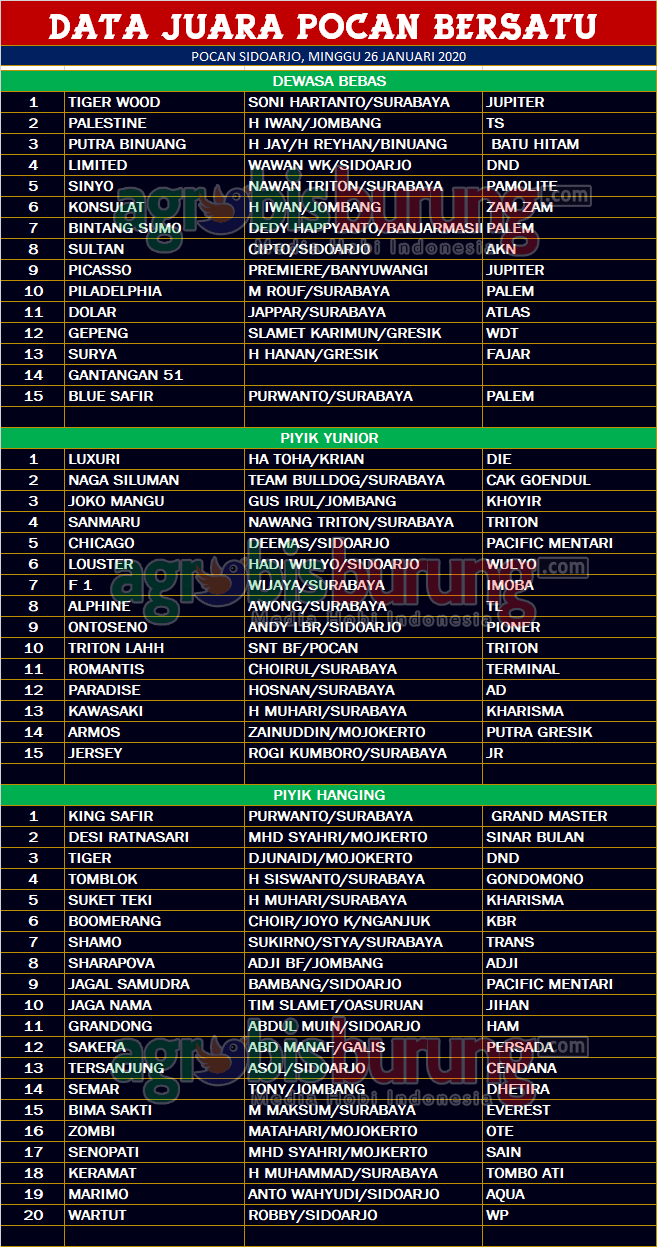 Headline Hobi Burung Juara Organizer Perkutut Perkutut Profil Data Juara Perkutut Pocan Bersatu Di Pocan Sidoarjo, Minggu 26 Januari agrobisburung 26 Januari 2020 AGROBISBURUNG.COM – SIDOARJO. Data Juara Perkutut Pocan Bersatu Di Pocan Sidoarjo, Minggu 26 Januari Tinggalkan Komentar Post navigation Previous: Data Juara Perkutut Noufus BF Cup di Pamekasan, Minggu 26 JanuariNext: Data Juara Perkutut Pengda Cilacap Cup, Minggu 26 Januari More Stories Headline Juara Perkutut Jawara Putra Ttasik (Patas), Jengiskhan & Cah Triple Two Melejit Ke Podium Pertama Liga Bumi Roban #1 di Tuban 2026 agrobisburung 26 Januari 2026 Headline Juara Perkutut Pesertanya Luar Biasa di Opening Liga Batavia 2026, Jawara Rodtang, Kingdom, Gas Lee & Bintang Baru Melesat ke Podium Puncak agrobisburung 26 Januari 2026 Headline Juara Perkutut Latihan Dinilai Spesial “Hanging” Disambut Antusiasme Kungmania Priangan Timur, Peresmian Pengurus Baru P3SI Pengda Ciamis-Pangandaran, Putra Wibawa Ngorbit & Sabila Kencana BF Mendominasi agrobisburung 26 Januari 2026