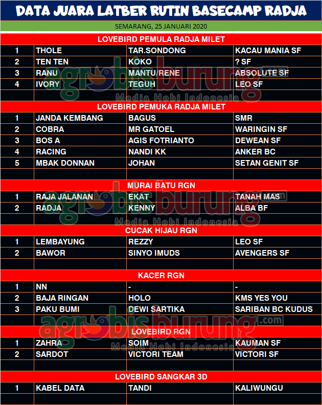 Headline Hobi Burung Juara Kicauan Kicauan Organizer Profil Data Juara Kicauan Latber Ruitn Basecamp Radja di Semarang, Sabtu 25 Januari agrobisburung 27 Januari 2020 KELUARGA FIGHTER MENDAPAT FREE TIKET LATBER DEPAN AGROBISBURUNG.COM – SEMARANG. Data Juara Kicauan Latber Ruitn Basecamp Radja di Semarang, Sabtu 25 Januari KELUARGA FIGHTER MENDAPAT FREE TIKET LATBER DEPAN JUARA KELAS RGN PLUS RP.500 KELUAR Tinggalkan Komentar Post navigation Previous: Data Juara Perkutut Pengda Cilacap Cup, Minggu 26 JanuariNext: Data Juara Kicauan Spesial Latpres RJBC Di Karangawen Semarang, Minggu 26 Januari More Stories Headline Perkutut Profil “Double” Transaksi Spektakuler : Akhirnya Jawara Palestine Andalan H. Handang Semarang di-Take Over Hendry WAT Tasikmalaya & K-WAT Delon Dijebol Sandy ITP agrobisburung 15 Januari 2026 Headline Perkutut Profil Golsindo BF Jakarta Rilis Formasi Kandang 2026, Andalkan Materi Indukan Terbaik, Siap Cetak Perkutut Kualitas Lomba dengan Bobot Suara Istimewa agrobisburung 14 Januari 2026 Headline Perkutut Profil Nunu Depok “Turun Gunung” Langsung Borong 5 Pasang K-Unggulan WAT BF Tasikmalaya, H. Pendi Nadira Jakarta Jebol K-WAT Brahmana & BDB BF Lombok Jebol K-WAT Raja Ampat agrobisburung 13 Januari 2026
