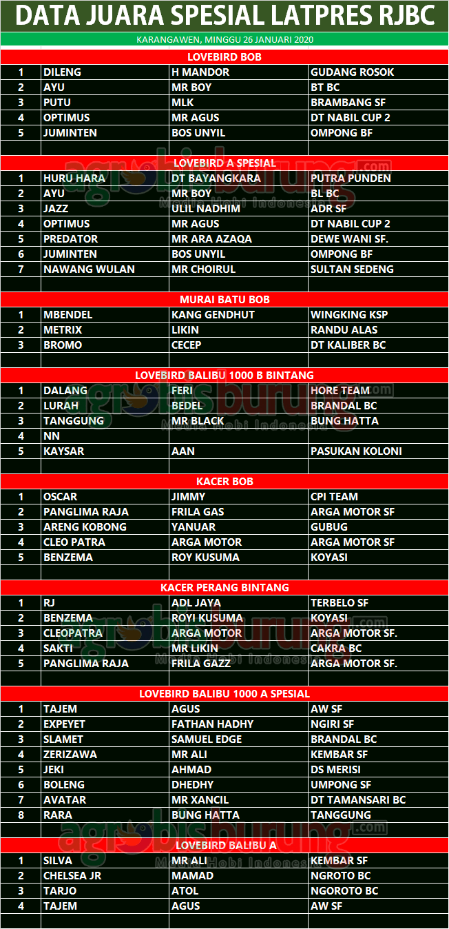 AGROBISBURUNG.COM – SEMARANG. Data Juara Kicauan Spesial Latpres RJBC Di Karangawen Semarang, Minggu 26 Januari