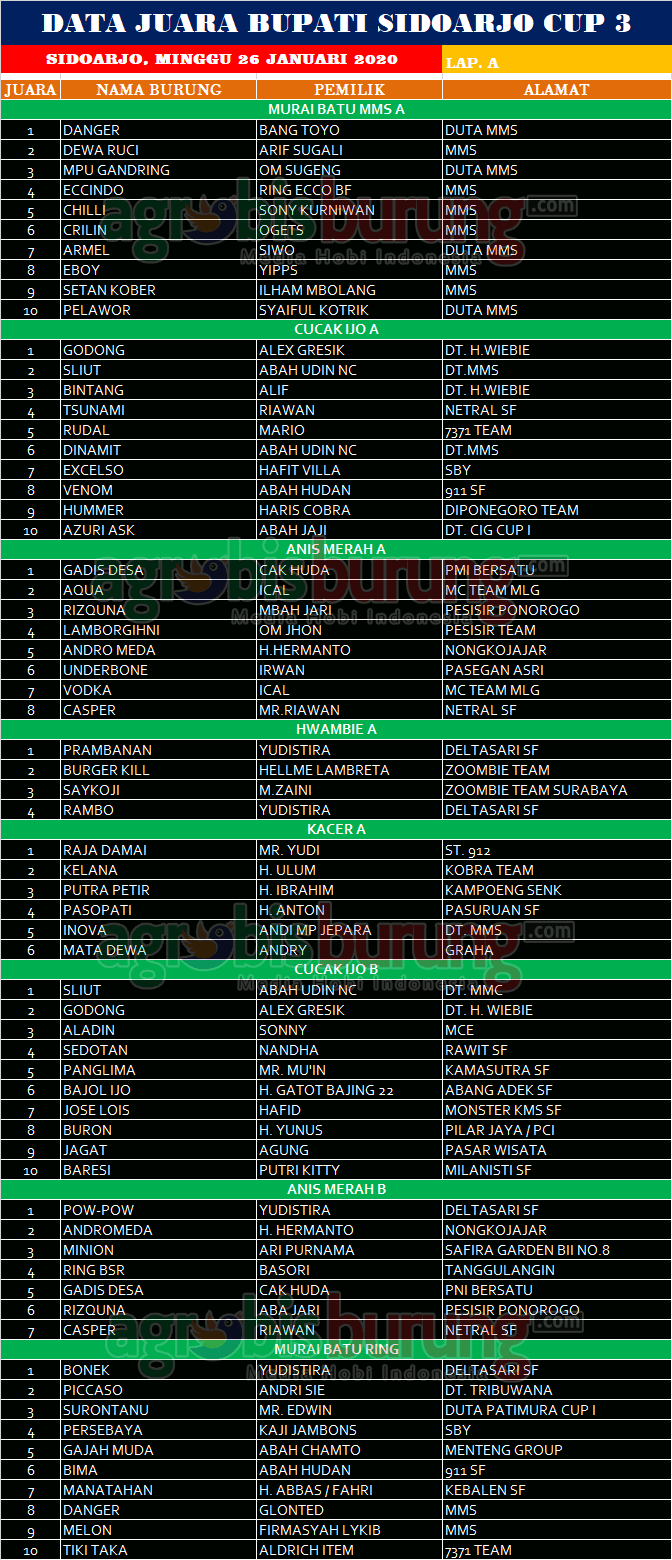 Headline Hobi Burung Juara Kicauan Kicauan Organizer Profil Data Juara Kicauan Bupati Sidoarjo Cup 3, Minggu 26 Januari (LAP. A) agrobisburung 28 Januari 2020 Love Bird Suwarti Raih Quartrick AGROBISBURUNG.COM – SIDOARJO. Data Juara Kicauan Bupati Sidoarjo Cup 3, Minggu 26 Januari (LAP. A) Love Bird Suwarti Raih Quartrick Tinggalkan Komentar Post navigation Previous: Data Juara Perkutut Intan Cup di Garut, Minggu 26 JanuariNext: Data Juara Kicauan Bupati Sidoarjo cup 3, Minggu 26 Januari (LAP. B) More Stories Headline Perkutut Profil “Double” Transaksi Spektakuler : Akhirnya Jawara Palestine Andalan H. Handang Semarang di-Take Over Hendry WAT Tasikmalaya & K-WAT Delon Dijebol Sandy ITP agrobisburung 15 Januari 2026 Headline Perkutut Profil Golsindo BF Jakarta Rilis Formasi Kandang 2026, Andalkan Materi Indukan Terbaik, Siap Cetak Perkutut Kualitas Lomba dengan Bobot Suara Istimewa agrobisburung 14 Januari 2026 Headline Perkutut Profil Nunu Depok “Turun Gunung” Langsung Borong 5 Pasang K-Unggulan WAT BF Tasikmalaya, H. Pendi Nadira Jakarta Jebol K-WAT Brahmana & BDB BF Lombok Jebol K-WAT Raja Ampat agrobisburung 13 Januari 2026