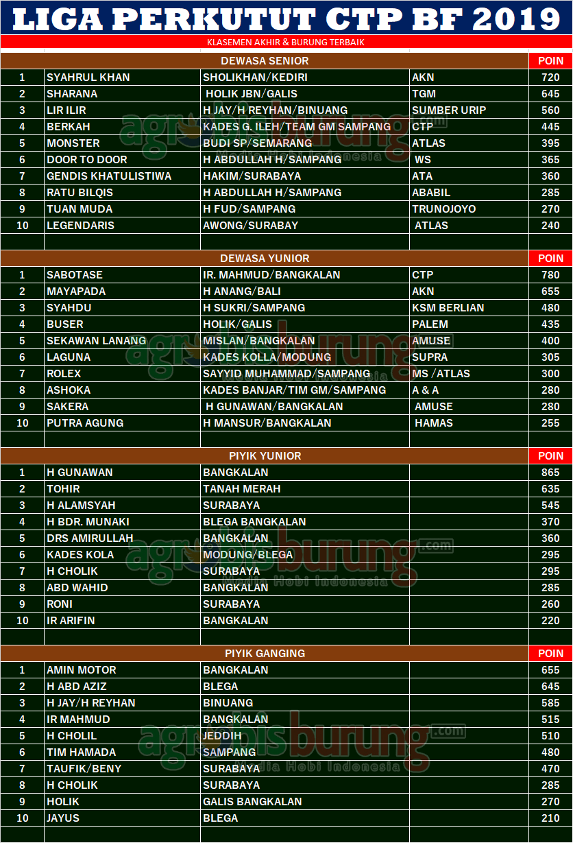 Headline Hobi Burung Juara Kicauan Kicauan Organizer Profil Data Perkutut Klasemen Akhir Liga Perkutut CTP BF 2019 di Bangkalan, Minggu 02 Februari agrobisburung 2 Februari 2020 AGROBISBURUNG.COM – BANGKALAN. Data Perkutut Klasemen Akhir Liga Perkutut CTP BF 2019 di Bangkalan, Minggu 02 Februari Tinggalkan Komentar Post navigation Previous: Data Juara Perkutut Liga Perkutut CTP BF Bangkalan, Minggu 02 Februari (Putaran Akhir)Next: Data Juara Liga Perkutut Madiun 2019, Minggu 02 Februari More Stories Headline Perkutut Profil Suhartono SH Cirebon Masih Mengandalkan Trah Jawara Legendaris-Superman, Maria Sharapova Anak Jawara Mariah Carey Generasi Terkini SH BF Moncer di Sumedang agrobisburung 1 Desember 2025 Headline Hobi Lain Juara Perkutut Maria Sharapova Memimpin, Saritomo Reborn Terbaik, Nakula Ngorbit & UKI Team Palu Borong Juara di Liga Sumaci #6 Ruby Star Cup Sumedang agrobisburung 30 November 2025 Headline Juara Perkutut Jawara Seruling, Sanca & Jupiter Jadi Burung Terbaik di Liga Hanging Nglaras Bareng Peternak Ponorogo 2025 agrobisburung 30 November 2025
