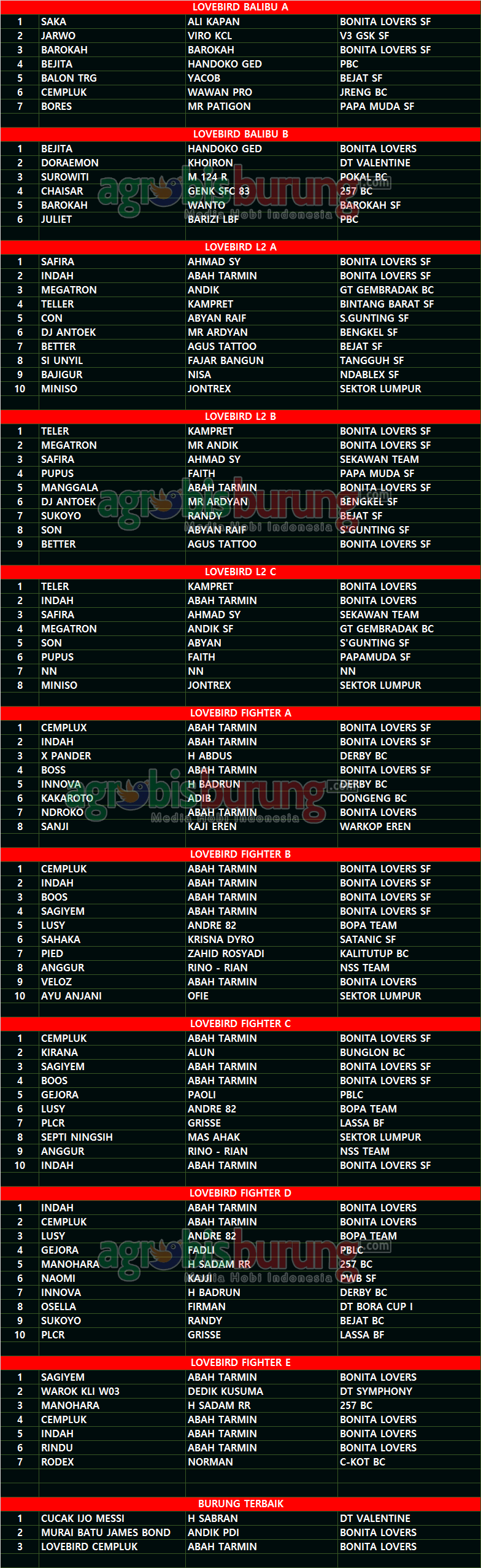 Headline Hobi Burung Juara Kicauan Kicauan Organizer Profil Data Juara Kicauan Anniversary 5 LBG Di Gagak Sakti Gresik, Minggu 09 Februari agrobisburung 11 Februari 2020 DT Valentine Juara Umum BC AGROBISBURUNG.COM – GRESIK. Data Juara Kicauan Anniversary 5 LBG Di Gagak Sakti Gresik, Minggu 09 Februari DT Valentine Juara Umum BC Bonita Lovers Juara Umum SF Tinggalkan Komentar Post navigation Previous: Data Juara Kicauan Cendeter Indonesia di Dewa 99 Surabaya, Minggu 09 FebruariNext: Data Juara Kicauan Sumowage Cup di Magelang, Minggu 09 Februari More Stories Headline Hobi Lain Perkutut Profil Christa Dwipa Praya NTB, Bakal Comeback Lomba Dengan Amunisi Ciamik Miliknya agrobisburung 17 Desember 2025 Headline Perkutut Profil Carpenter BF Mataram NTB, Kembangkan 50 Kandang Unggulan Dengan Trah Jawara agrobisburung 16 Desember 2025 Headline Perkutut Profil Satu Lagi Big Bos Asal NTB Bakal Ramaikan Perkutut Nasional 2026, Samuel BLT Arrowhead Siap Berkolaborasi HDL – Carpenter Dengan Amunisi Istimewa agrobisburung 15 Desember 2025