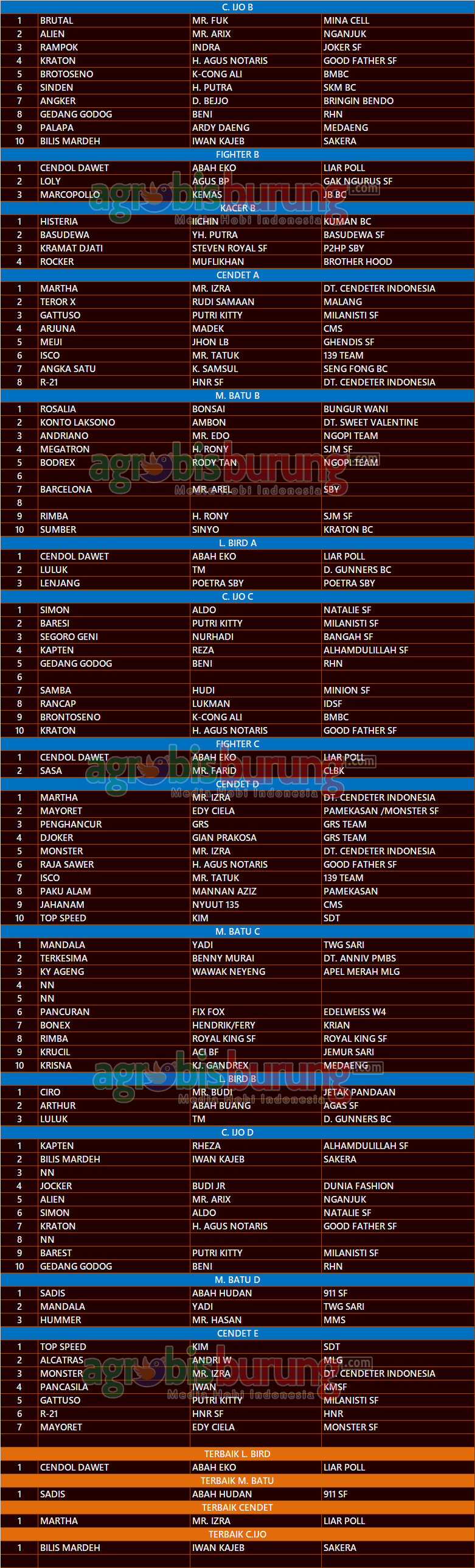 Headline Hobi Burung Juara Kicauan Kicauan Layanan Lingkungan & IPTEK Organizer Profil Data Juara Kicauan Cendeter Indonesia di Dewa 99 Surabaya, Minggu 09 Februari agrobisburung 11 Februari 2020 AGROBISBURUNG.COM – SURABAYA. Data Juara Kicauan Cendeter Indonesia di Dewa 99 Surabaya, Minggu 09 Februari Tinggalkan Komentar Post navigation Previous: Data Juara Kicauan Lounching Latber Minggu Siang di Graha Padma Semarang, Minggu 09 FebruariNext: Data Juara Kicauan Anniversary 5 LBG Di Gagak Sakti Gresik, Minggu 09 Februari More Stories Headline Perkutut Profil Telah Mendarat di Markas WAT BF Tasikmalaya Puluhan Ekor Produk Import Terkini dari Thailand, Hendry WAT Jebol 9 Trah Jawara Hero-JBP dari AD BF Chana agrobisburung 22 Oktober 2025 Headline Juara Perkutut Jawara Taktis & Terlanjur Melenggang Manis di Podium Latihan Dinilai Arisan Kaliwono Sukowono Jember agrobisburung 22 Oktober 2025 Headline Perkutut Profil Iswanto BSD Koleksi Burung Perkutut Kualitas & Mulai Siapkan Kandang, Di-Support Materi Import (KNY-AD) Plus Produk Terkini WAT BF Tasikmalaya agrobisburung 21 Oktober 2025