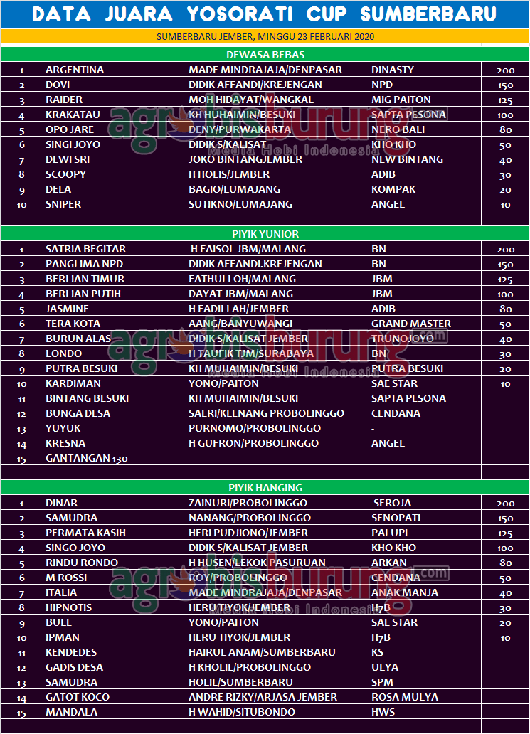 Headline Hobi Burung Juara Organizer Perkutut Perkutut Profil Data Juara Perkutut Yosorati Cup 2020 Di Surmberbaru Jember, Minggu 23 Februari agrobisburung 23 Februari 2020 AGROBISBURUNG.COM – JEMBER. Data Juara Perkutut Yosorati Cup 2020 Di Surmberbaru Jember, Minggu 23 Februari Tinggalkan Komentar Post navigation Previous: Data Juara Perkutut Liga Bangkalan Bangkit # 1 di Tanah Merah, Minggu 23 FebruariNext: Beri Uang Pembinaan ke Pengda ; PM Suyanto kembali Jadi Ketua Pengwil DIY 2020 -2025 More Stories Headline Juara Perkutut Pemanasan Jelang Pembukaan LPJB 2026, Unicorn Naik Kelas & Cirebon Trusmi Ngorbit di Liga Kopi Luhur #6 (Penutupan Poin) Cirebon agrobisburung 18 Januari 2026 Headline Hobi Lain Juara Perkutut Jawara Airlanga Moncer Bareng bersama Antsena & Mr M-307 Di Latihan Dinilai Tarkam Galaxy Gresik agrobisburung 18 Januari 2026 Headline Juara Perkutut Jawara Red Bull “Pecah Telor” Empat Warna Di Latihan Dinilai Dewandaru Tulungagung, Jawara Sulur Mas & Deva Alam Moncer di Podium Utama agrobisburung 18 Januari 2026