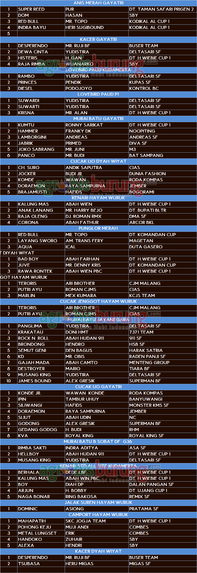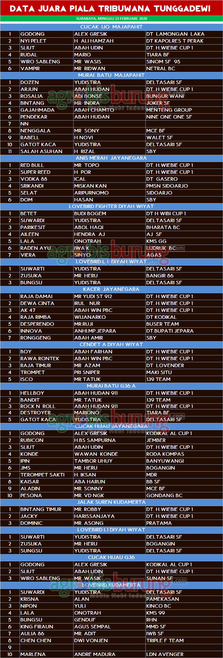 AGROBISBURUNG.COM – SURABAYA. Data Juara Kicauan Piala Tribuwana Tunggadewi di Surabaya, Minggu 23 Februari