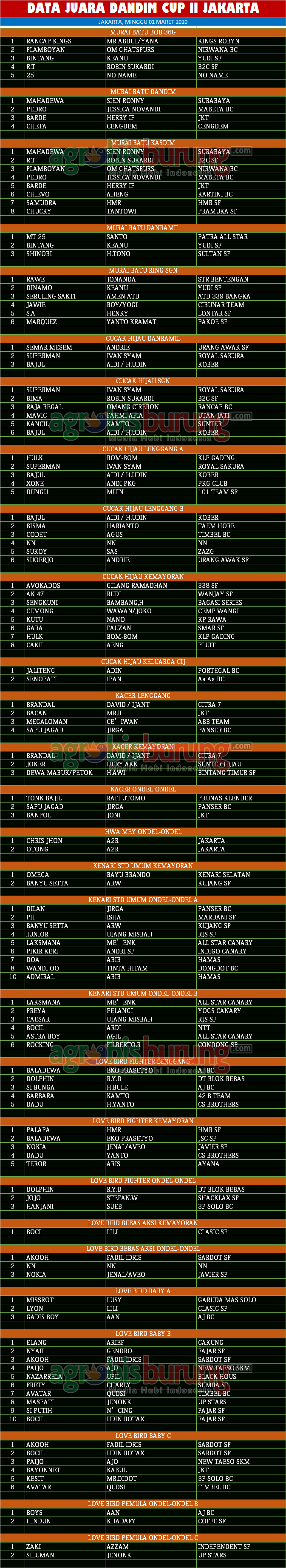AGROBISBURUNG.COM – JAKARTA. Data Juara Kicauan Dandim Cup II Jakarta, Minggu 01 Maret