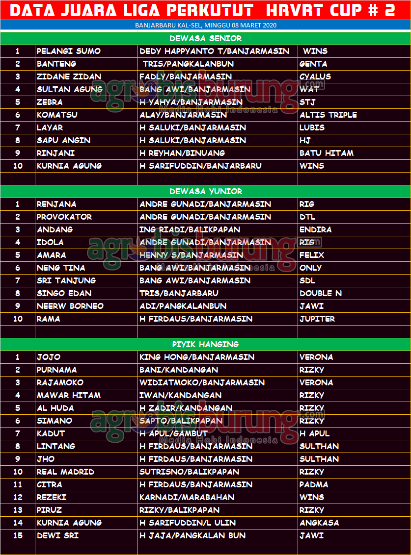 Di kelas dewasa yunior, Renjana milik Andre Gunadi bergelang RIG masih menjadi yang terbaik di kelasnya, bertarung tanpa bebean Renjana mampu mengunguli Provokator bergelang DTL dan Andang bergelang Endira yang berada diperingkat kedua dan ketiga. Sementara itu di kelas piyik hanging orbitan anyar Verona BF yang diusung sang owner King Hong dengan nama Jojo juga memberikan pembuktian bahwa produk Verona memang layak menang. Dengan kualitas mental bertarung yang top, Jojo mampu menyingkirkan Purnama bergelang Rizky dan Rajamoko bergelang Verona yang bertengger di peringkat kedua dan ketiga kejuaraan hanging.