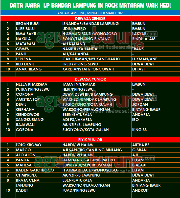 AGROBISBURUNG.COM – LAMPUNG. Mengusung motto “Perkutut Bandar Lampung Berseri” dengan label lomba In Rock Mataram Wakhedi Cup 2020 yang digelar pada Minggu (08/03) di Bandar Lampung langsung mendapat respon yang luar biasa dari Kungmania Lampung dan sekitarnya. Lomba yang dibuka dengan sambutan ketua pengda Bandra Lampung, Heru Subagyo dan ketua pantia Tama Apriyadi langsung memainkan 3 kelas lomba dewasa senior, dewasa yunior dan piyik yunior. Di kelas dewasa senior, duet produk Embun bernama Regan Bumi milik Isnandar dan Uler Bulu milik Udin menjadi penguasa podium utama senior dengan menjadi penguasa ke-1 dan ke-2, sementara Bima Sakti miliki H Ahmad Fauzi menempati posisi ketiga.