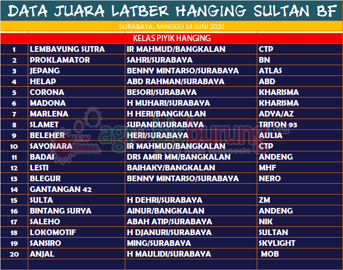 Data Juara Perkutut Latber Hanging Sultan BF, Minggu 14 Juni