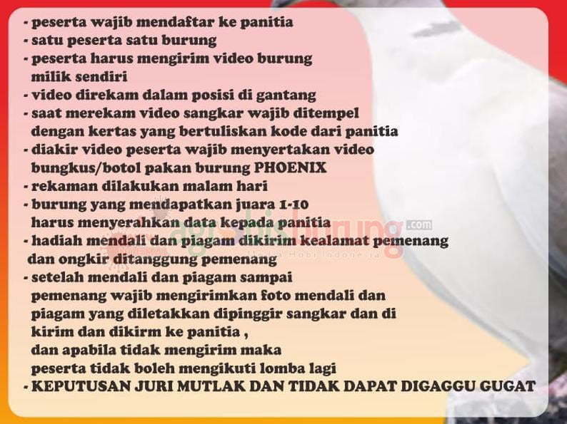MADIUN, agrobisburung.com – Lomba Puter online yang digelar setiap Minggu 2 kali ini ternyata pesertanya bisa menjangkau lebih luas, karena bisa dilakukan secara digital sehingga tidak dibatasi jarak, bahkan tidak menutup kemungkinan tidak hanya diikuti dari pulau Jawa tetapi bisa merambah seluruh nusantara bahkan manca negara. Terlihat dari kontes yang digelar untuk pemula Rabu (8/7) juaranya kelihatan merata dari ujung timur pulau Jawa sampai ujung barat pulau Jawa. Dan juga berkat dukungan Pakan Puter/Derkuku Phoenix pesertanya juga semakin antusias karena rata rata juga memakai dan merasakan langsung kualitas produk Phoenix yang oke tentunya.