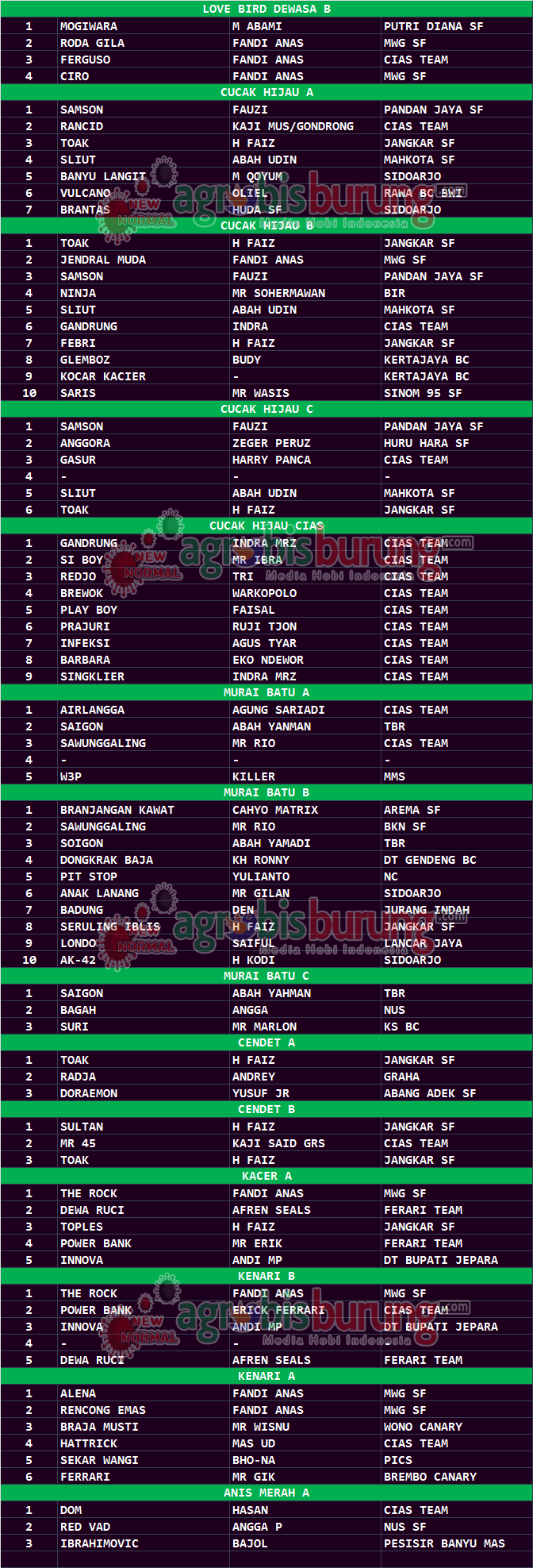 Headline Hobi Burung Juara Kicauan Kicauan Organizer Profil Data Juara Halal Bihalal BMW Company di IBM BC Surabaya, Minggu 12 Juli agrobisburung 13 Juli 2020 DT CIAS Juara Umum BC SURABAYA, agrobisburung.com – Data Juara Halal Bihalal BMW Company di IBM BC Surabaya, Minggu 12 Juli DT CIAS Juara Umum BC Juara Umum MWG SF Tinggalkan Komentar Post navigation Previous: Tuban mulai latber perdana dengan tumpengan untuk kebersamaan KungmaniaNext: Di Masa New Normal Pandemi Covid-19 Kandang Pengembangan Trah Havana di JnJ Bf Jogja Semakin Diburu kungmania More Stories Headline Perkutut Profil Pramando Jakarta Penghobi Pemula Pemberani, Siapkan Amunisi Lomba dengan Memborong Produk Terkini WAT BF Tasikmalaya Plus Booking Kandang WAT Slipknot & WAT Revolusi agrobisburung 20 November 2025 Headline Juara Perkutut Tetap Semangat Ke Lapangan, Jawara Champion & Galih Jati Bikin Kejutan Di Latihan Dinilai Rabuan Marina Semarang agrobisburung 20 November 2025 Headline Hobi Lain Perkutut Profil Jawara Ruby Star Ikon Prima Rasa Team Bandung, Selama 2,5 Tahun Eksis di Papan Atas & Sudah Menjajal Semua Gelaran Lintas Blok agrobisburung 19 November 2025