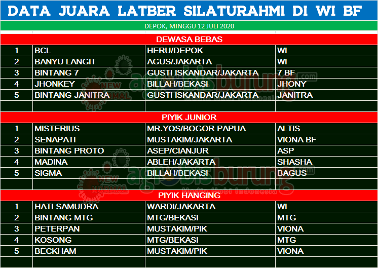 Data Juara Perkututu latber Silaturahmi di WI BF Depok, Minggu 12 Juli