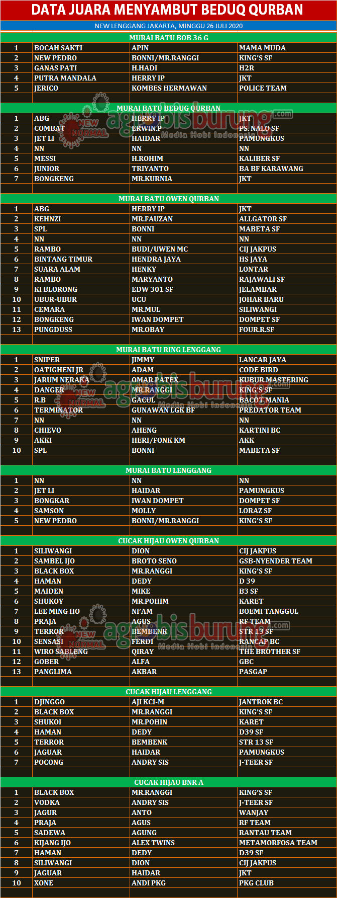Data Juara Kicauan Beduq Qurban di New Lenggang Jakarta, Minggu 26 Juli