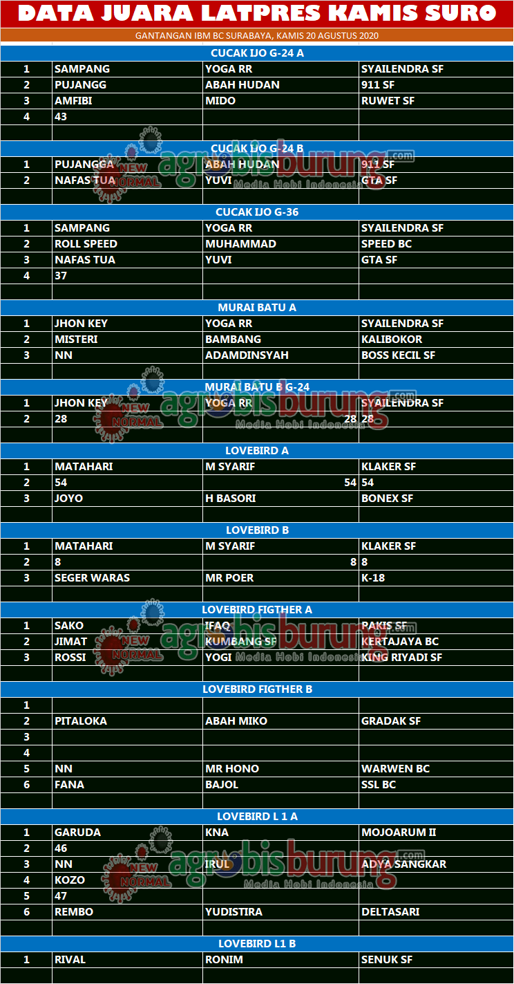 SURABAYA, agrobisburung.com – Data Juara Latpres Kamis SURO di Gantangan IBM BC, Kamis 20 Agustus