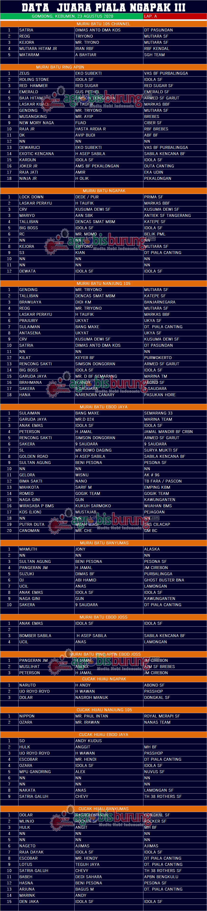 Headline Hobi Burung Juara Kicauan Kicauan Data Juara Piala Ngapak III di Gombong Kebumen, Minggu 23 Agustus Lap A & B agrobisburung 24 Agustus 2020 Data Juara Piala Ngapak III di Gombong Kebumen, Minggu 23 Agustus Lap A & B Tinggalkan Komentar KEBUMEN, agrobisburung.com – Data Juara Piala Ngapak III di Gombong Kebumen, Minggu 23 Agustus Lap A & B Tinggalkan Komentar Post navigation Previous: MB Torpedo Kembali Tampil Mewah di Bekasi BangkitNext: Selendang Sutra Come Back, Satria & Oreo Berjaya di Konkurs P3SI Pengda Kab. Bandung More Stories Headline Hobi Lain Perkutut Profil Jawara Ruby Star Ikon Prima Rasa Team Bandung, Selama 2,5 Tahun Eksis di Papan Atas & Sudah Menjajal Semua Gelaran Lintas Blok agrobisburung 19 November 2025 Headline Juara Perkutut Latihan Dinilai Arisan Kaliwono, Dawuhan Sukowono Jadi Ajang Persiapan lomba, Jawara Suci & Rujak Cingur Tampil Joss agrobisburung 18 November 2025 Headline Perkutut Profil UKI BF Palu-Sulteng Siap Andalkan Hasil Produk Sendiri, Kakak-Adik Trah Jawara Domisol Moncer: Libanon Stabil & Seruni Terbaik LPJB #9 “Final Point” Majalengka agrobisburung 18 November 2025