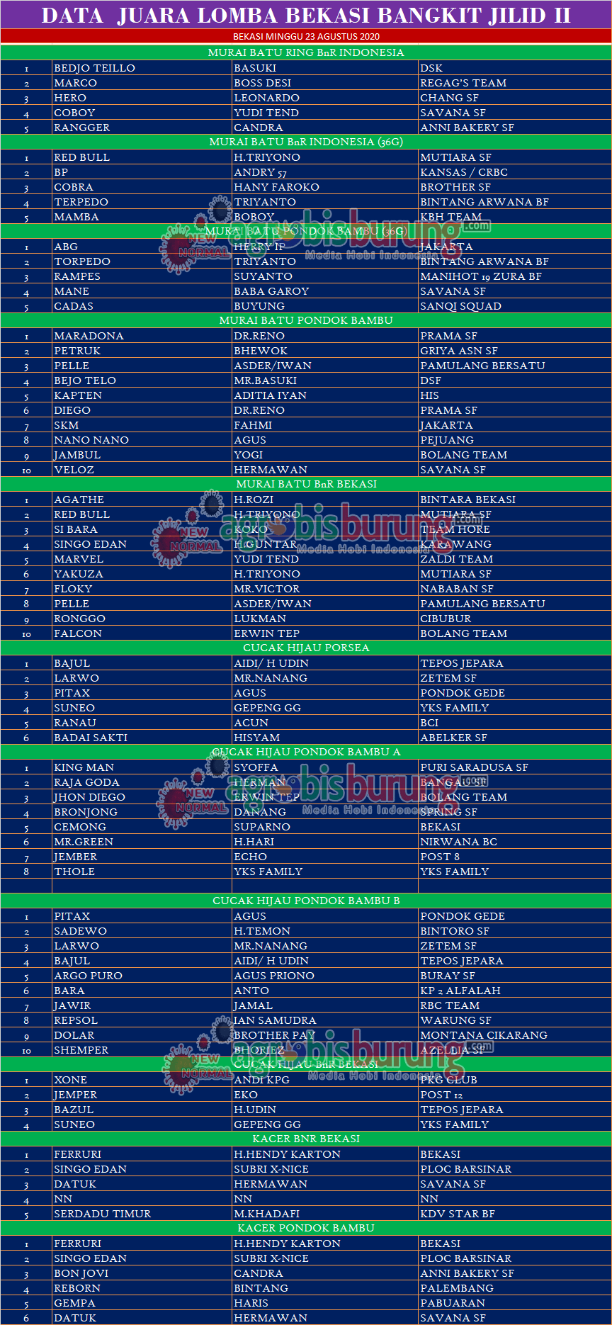 Headline Hobi Burung Juara Kicauan Kicauan Organizer Profil Data Juara Lomba Bekasi Bangkit Jilid II di Bekasi, Minggu 23 Agustus agrobisburung 25 Agustus 2020 Data Juara Lomba Bekasi Bangkit Jilid II di Bekasi, Minggu 23 Agustus Tinggalkan Komentar BEKASI, agrobisburung.com – Data Juara Lomba Bekasi Bangkit Jilid II di Bekasi, Minggu 23 Agustus Tinggalkan Komentar Post navigation Previous: Data Juara Kicauan Anniversary Sobat DF di Sidoarjo, Minggu 23 AgustusNext: MB Bedjo Teillo, Agathe & Rampes Naik Podium di Bekasi Bangkit More Stories Headline Hobi Lain Perkutut Profil Jawara Ruby Star Ikon Prima Rasa Team Bandung, Selama 2,5 Tahun Eksis di Papan Atas & Sudah Menjajal Semua Gelaran Lintas Blok agrobisburung 19 November 2025 Headline Juara Perkutut Latihan Dinilai Arisan Kaliwono, Dawuhan Sukowono Jadi Ajang Persiapan lomba, Jawara Suci & Rujak Cingur Tampil Joss agrobisburung 18 November 2025 Headline Perkutut Profil UKI BF Palu-Sulteng Siap Andalkan Hasil Produk Sendiri, Kakak-Adik Trah Jawara Domisol Moncer: Libanon Stabil & Seruni Terbaik LPJB #9 “Final Point” Majalengka agrobisburung 18 November 2025
