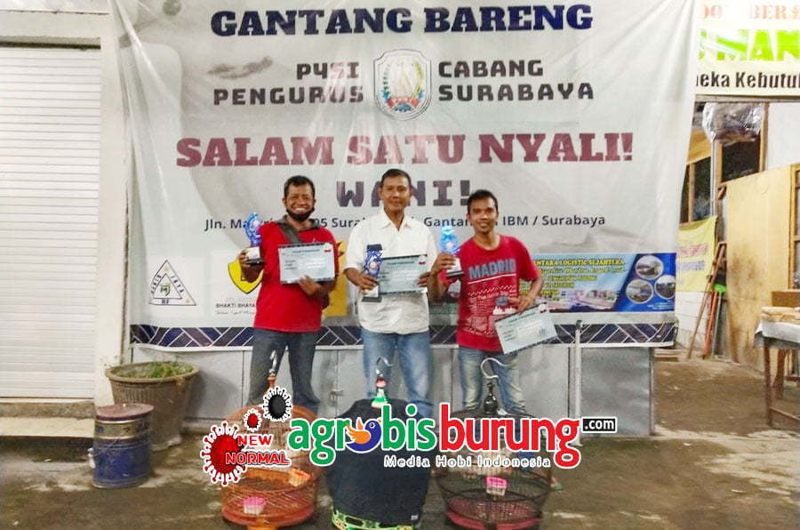 Surabaya, Agrobisburung.Com – Latihan bersama yang digelar untuk kali ke 8 oleh P4SI pengcab Surabaya dalam rangka memperingati HUT RI ke 75 (baca : Agustusan) di gantangan IBM (26/8) mampu mengantarkan Klenying & Arpol berjaya keluar sebagai juara I. Lomba yang dilaksanakan rutin ini memang menjadi agenda para puter mania untuk sebagai ajang untuk unjuk prestasi bagi burung-burung pemula atau untuk melatih mental bertarung sebelum turun ke arena yang lebih besar.