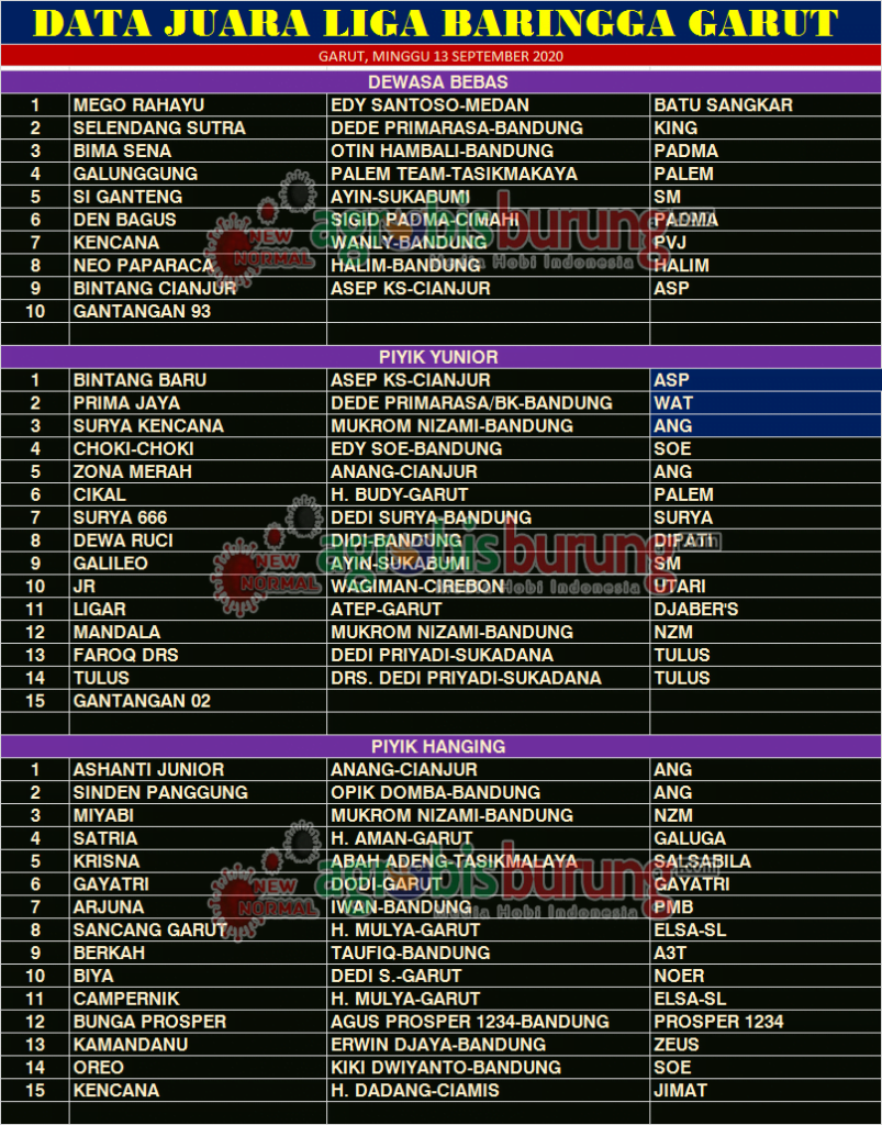 Data Juara Perkutut Liga Baringga di Garut, Minggu 13 September