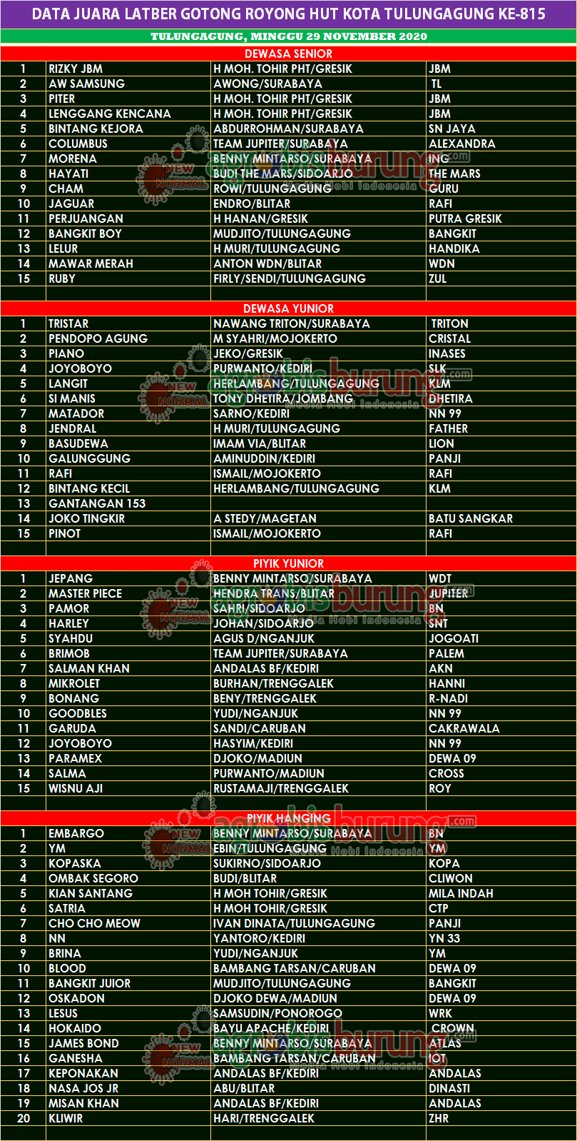 Headline Hobi Burung Juara Organizer Perkutut Perkutut Profil Data Juara Perkutut Latber Gotong Royong dalam rangka HUT Kota Tulungagung ke-815, Minggu 29 November agrobisburung 30 November 2020 TULUNGAGUNG, agrobisburung.com – Data Juara Perkutut Latber Gotong Royong dalam rangka HUT Kota Tulungagung ke-815, Minggu 29 November Tinggalkan Komentar Post navigation Previous: Data Juara Liga Perkutut Jogja Istimewa, Minggu 29 NovemberNext: Dihadiri Walikota Surabaya, IFPC Surabaya Sukses Gelar Pameran Perdana More Stories Headline Hobi Lain Perkutut Profil Siap Terjun Ke LPI 2026, Nurul Anggun Take Over Jawara Muda Hipersonik dari Kurniadi ASM Dengan Deal Fantastik agrobisburung 11 Februari 2026 Headline Juara Perkutut Profil Teamnya Semakin Solid, Jagonya Moncer di LP. Batavia #2 & Breedingnya Sudah Cetak Burung Ciamik agrobisburung 9 Februari 2026 Headline Hobi Lain Juara Perkutut Jawara Mistikus, Kingdom, Saritomo reborn & Bintang Baru Terbaik Utama di LP. #2 Batavia 2026 Bogor agrobisburung 9 Februari 2026