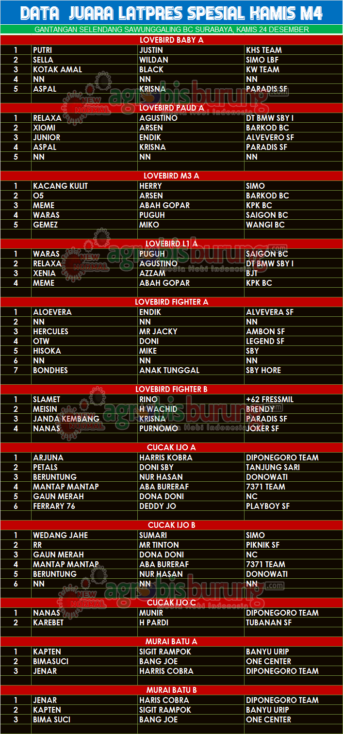 Headline Hobi Burung Juara Kicauan Kicauan Organizer Data Juara Latpres Spesial Kamis M4 di Surabaya, Rabu24 Desember agrobisburung 26 Desember 2020 Data Juara Latpres Spesial Kamis M4 di Surabaya, Rabu24 Desember Tinggalkan Komentar SURABAYA, agrobisburung.com – Data Juara Latpres Spesial Kamis M4 di Surabaya, Rabu24 Desember Tinggalkan Komentar Post navigation Previous: Turun Membawa 3 Amunisi Event SMM Feat BHS Gresik, Senopati Kaji Yasir Kolomunyeng Gresik Tampil CiamikNext: Diponegoro Team Tampil Dominan Dalam Kamis Spesial M4 Sawunggaling BC Surabaya More Stories Headline Perkutut Profil Telah Mendarat di Markas WAT BF Tasikmalaya Puluhan Ekor Produk Import Terkini dari Thailand, Hendry WAT Jebol 9 Trah Jawara Hero-JBP dari AD BF Chana agrobisburung 22 Oktober 2025 Headline Juara Perkutut Jawara Taktis & Terlanjur Melenggang Manis di Podium Latihan Dinilai Arisan Kaliwono Sukowono Jember agrobisburung 22 Oktober 2025 Headline Perkutut Profil Iswanto BSD Koleksi Burung Perkutut Kualitas & Mulai Siapkan Kandang, Di-Support Materi Import (KNY-AD) Plus Produk Terkini WAT BF Tasikmalaya agrobisburung 21 Oktober 2025