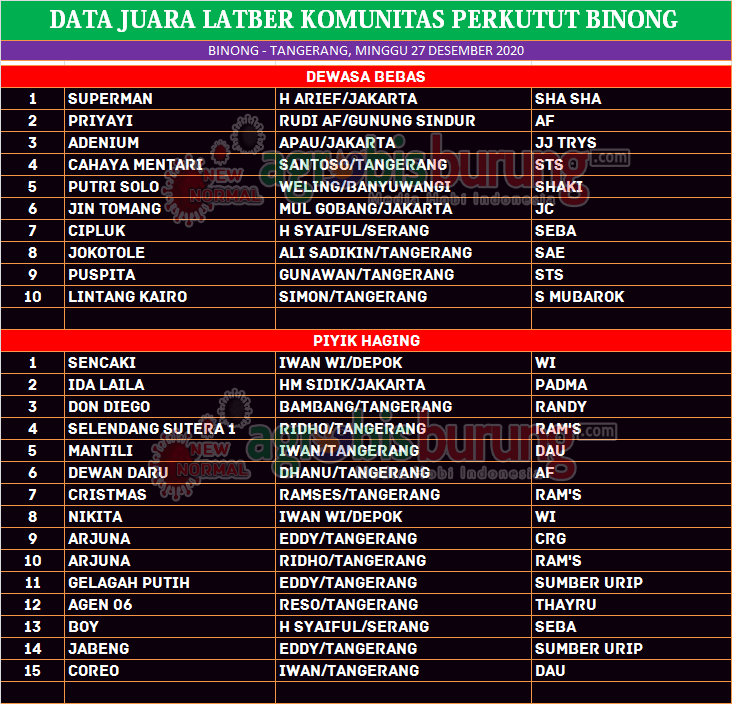 TANGERANG, agrobisburung.com –  Data Juara Perkutut Latber Komunitas di Binong Tangerng, Minggu 27 Desember