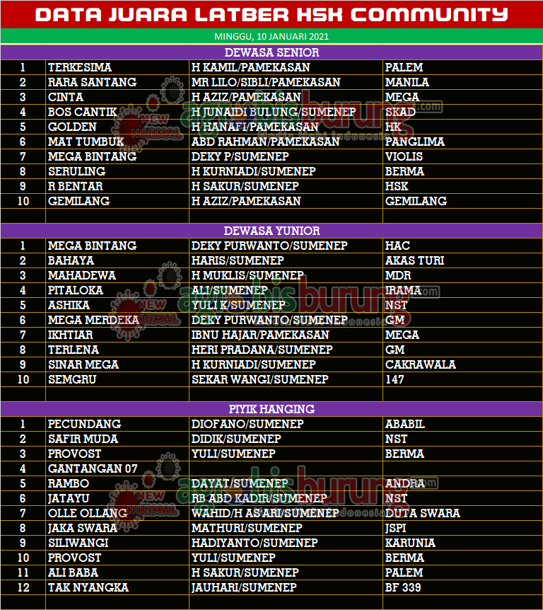 Di kelas dewasa yunior, debutan anyar Deky Purwanto bernama Mega Bintang bergelang HAC memberikan kejutan di penampilan perdananya di tahun 2021, dengan peforma terbaiknya Mega Bintang mampu mengatasi lawan lannya dan melenggang ke posisi pertama. Dan di kelas piyik hanging, jawara Pecundang bergelang Ababil milik Diofano Sumenep bermain aman untuk merebut peringkat pertama di kelasnya. AB-END