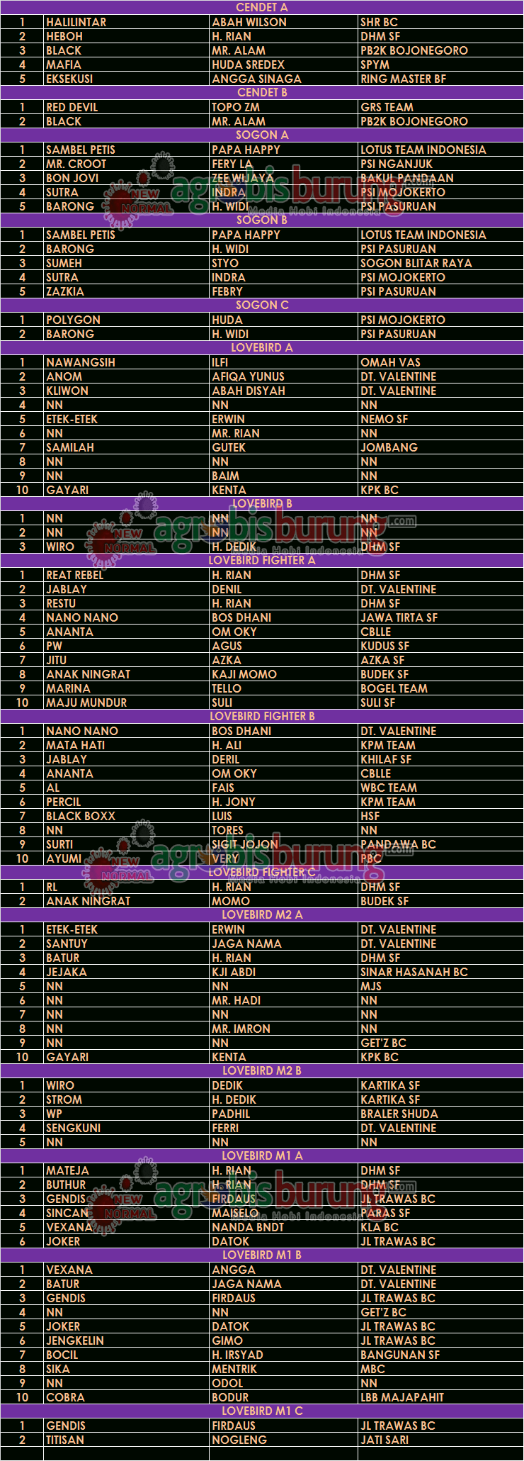 MOJOKERTO, agrobisburung.com – Data Juara Mbah Gito Cup 1 Balarama BC Feta Damai BC di Mojokerto, Minggu 24 Januari 2021