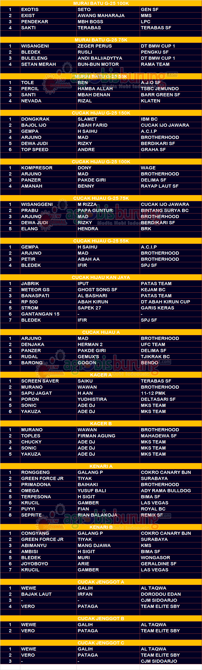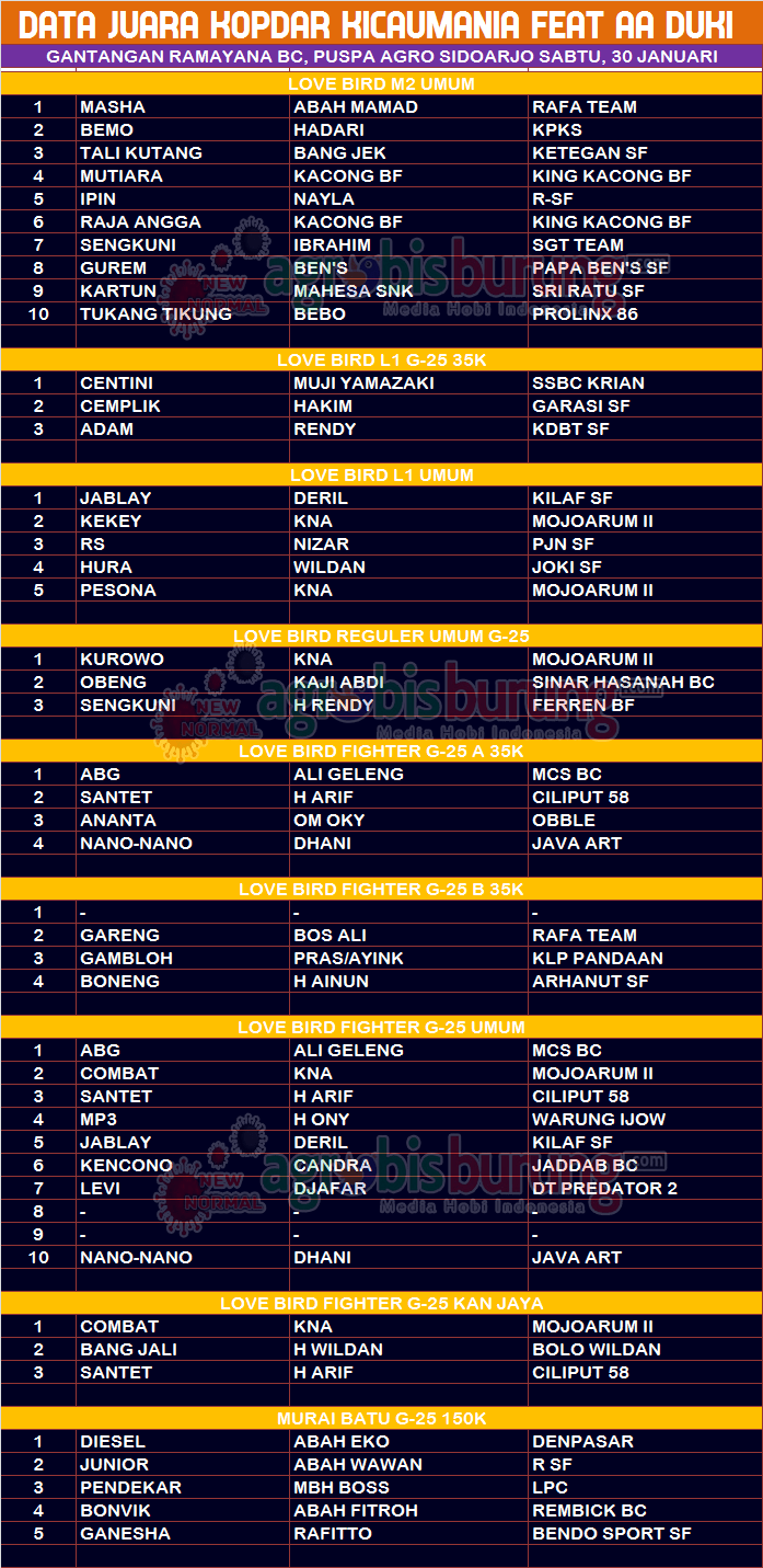 Data Juara Kicauan Kopdar Kicaumania Feat AA Duki di Ramayana BC Puspa Agro Sidoarjo, Sabtu 30 Januari