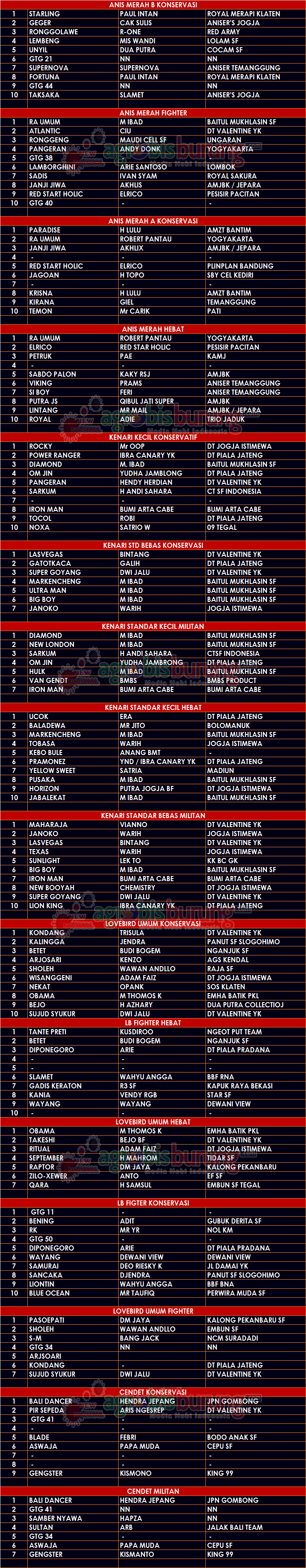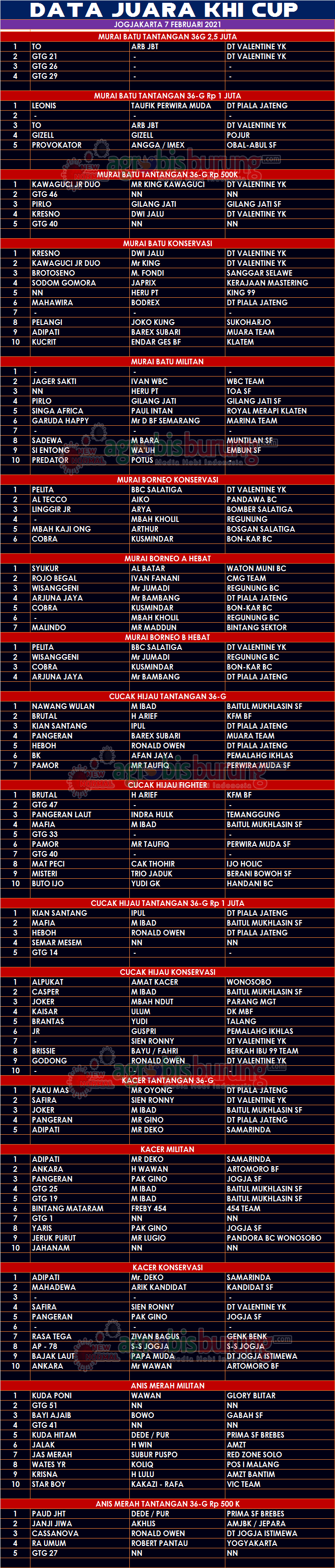 JOGJA, agrobisburung.com – Data Juara Kicauan KHI Cup di Jogjakarta, Minggu 07 Februari