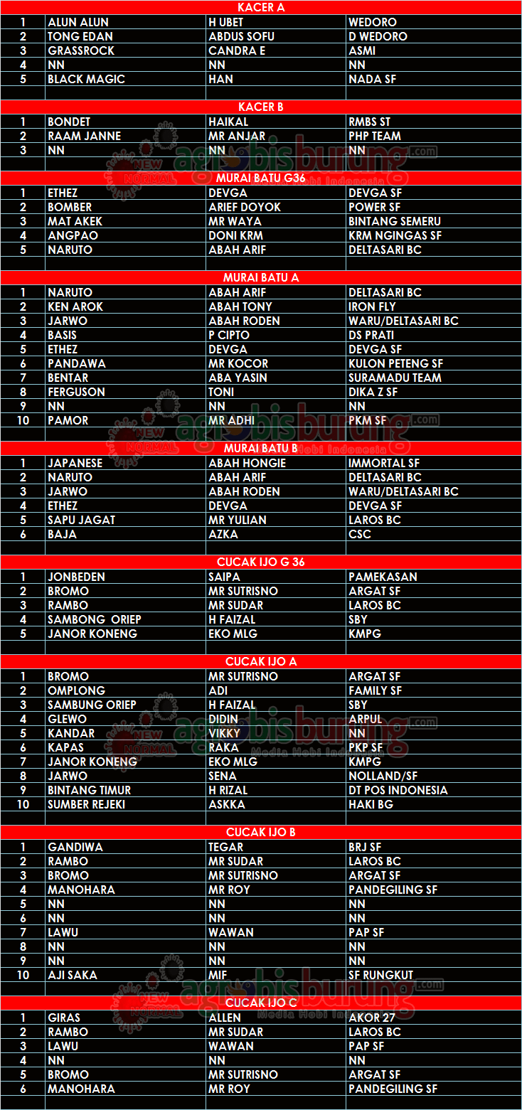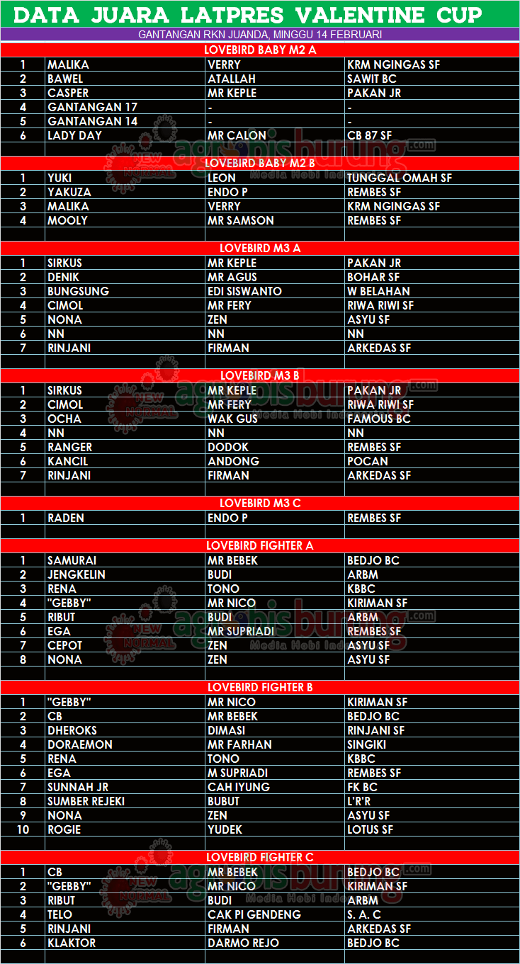 Headline Hobi Burung Juara Kicauan Kicauan Organizer Profil Data Juara Latpres Valentine Cup di RKN Juanda Sidoarjo, Minggu 14 Februari agrobisburung 16 Februari 2021 Data Juara Latpres Valentine Cup di RKN Juanda Sidoarjo, Minggu 14 Februari Tinggalkan Komentar SIDOARJO, agrobisburung.com – Data Juara Latpres Valentine Cup di RKN Juanda Sidoarjo, Minggu 14 Februari Tinggalkan Komentar Post navigation Previous: Jago Jago PLH Team Cilacap Rajai Liga Jimat Ciamis, Palem Team Tasik Menempel Diposisi Runner-UpNext: Sukses dengan kandang Basicnya, Ming Lounching Skylight 2 BF Surabaya untuk Kembangkan trah unggulan buat cetak burung lomba More Stories Headline Perkutut Profil Pramando Jakarta Penghobi Pemula Pemberani, Siapkan Amunisi Lomba dengan Memborong Produk Terkini WAT BF Tasikmalaya Plus Booking Kandang WAT Slipknot & WAT Revolusi agrobisburung 20 November 2025 Headline Juara Perkutut Tetap Semangat Ke Lapangan, Jawara Champion & Galih Jati Bikin Kejutan Di Latihan Dinilai Rabuan Marina Semarang agrobisburung 20 November 2025 Headline Hobi Lain Perkutut Profil Jawara Ruby Star Ikon Prima Rasa Team Bandung, Selama 2,5 Tahun Eksis di Papan Atas & Sudah Menjajal Semua Gelaran Lintas Blok agrobisburung 19 November 2025