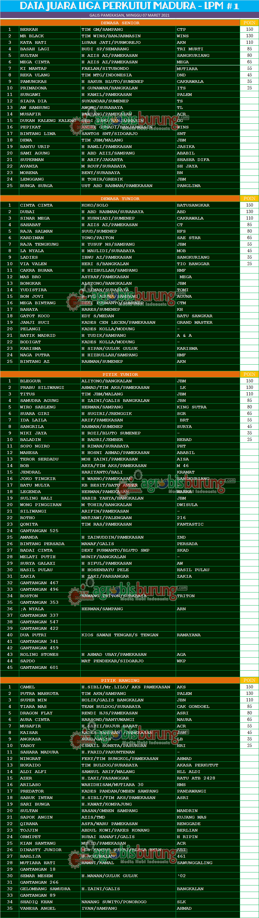 Data Juara Liga Perkutut Madura – LPM # 1 di Pamekasan, Minggu 07 Maret