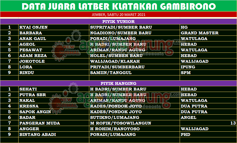 Sementara itu jalannya lomba yang meriah di Klatakan Gambirono Jember ini mempertontonkan persaingan di dua kelas yang di mainkan, di piyik yunior Kyai Onjen bergelang HG milik Supriyadi dari Sumberbaru meroket di kelas nya dan sukses mengungguli Barbara bergelang Grand Master dan Anak Gaul bergelang Watulaga yang harus puas dipodium dua dan tiga. Dan di kelas piyik hanging Sehati milik H Badri bergelang Hebad benar benar tampil dominan.