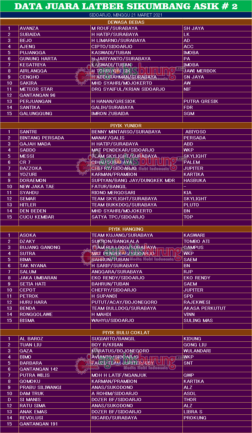 Headline Hobi Burung Juara Organizer Perkutut Perkutut Profil Data Juara Latber SIKUMBANG ASIK # 2 di Pilang Sidoarjo, Minggu 21 Maret agrobisburung 21 Maret 2021 Data Juara Latber SIKUMBANG ASIK # 2 di Pilang Sidoarjo, Minggu 21 Maret Tinggalkan Komentar SIDOARJO, agrobisburung.com – Data Juara Latber SIKUMBANG ASIK # 2 di Pilang Sidoarjo, Minggu 21 Maret Tinggalkan Komentar Post navigation Previous: Data Juara Perkutut New Makita Cup di Semarang, Minggu 21 MaretNext: Golden Boy & Jaguar Tampil Menawan di Latber Cilacap Barat More Stories Headline Perkutut Profil Nunu Depok “Turun Gunung” Langsung Borong 5 Pasang K-Unggulan WAT BF Tasikmalaya, H. Pendi Nadira Jakarta Jebol K-WAT Brahmana & BDB BF Lombok Jebol K-WAT Raja Ampat agrobisburung 13 Januari 2026 Headline Juara Perkutut Jawara Bandar Jawa 1, Boxer & Joko Tarub Melejit ke Podium Utama Di Latihan Dinilai Pengcam Pengantenan Pamekasan agrobisburung 12 Januari 2026 Headline Juara Perkutut Jawara Gading Asmara & Cah Samin Berkuasa Dikelasnya di Latihan Dinila Pengda Bojonegoro agrobisburung 11 Januari 2026