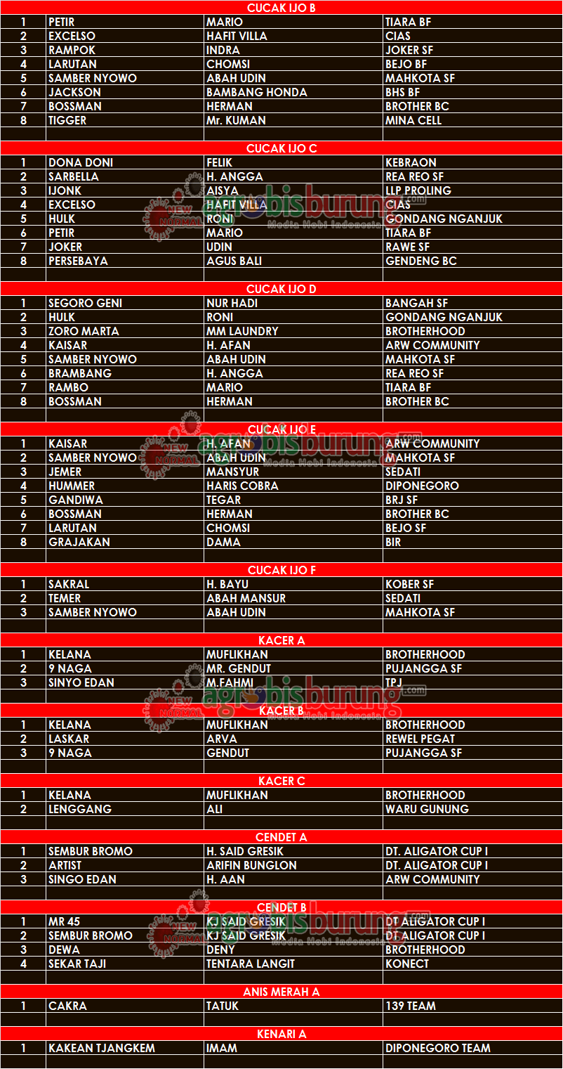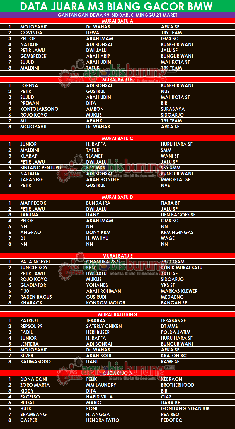 SIDOARJO, agrobisburung.com –  Data Juara M3 Biang Gacor BMW di Gantangan Dewa 99 Sidoarjo, Minggu 21 Maret