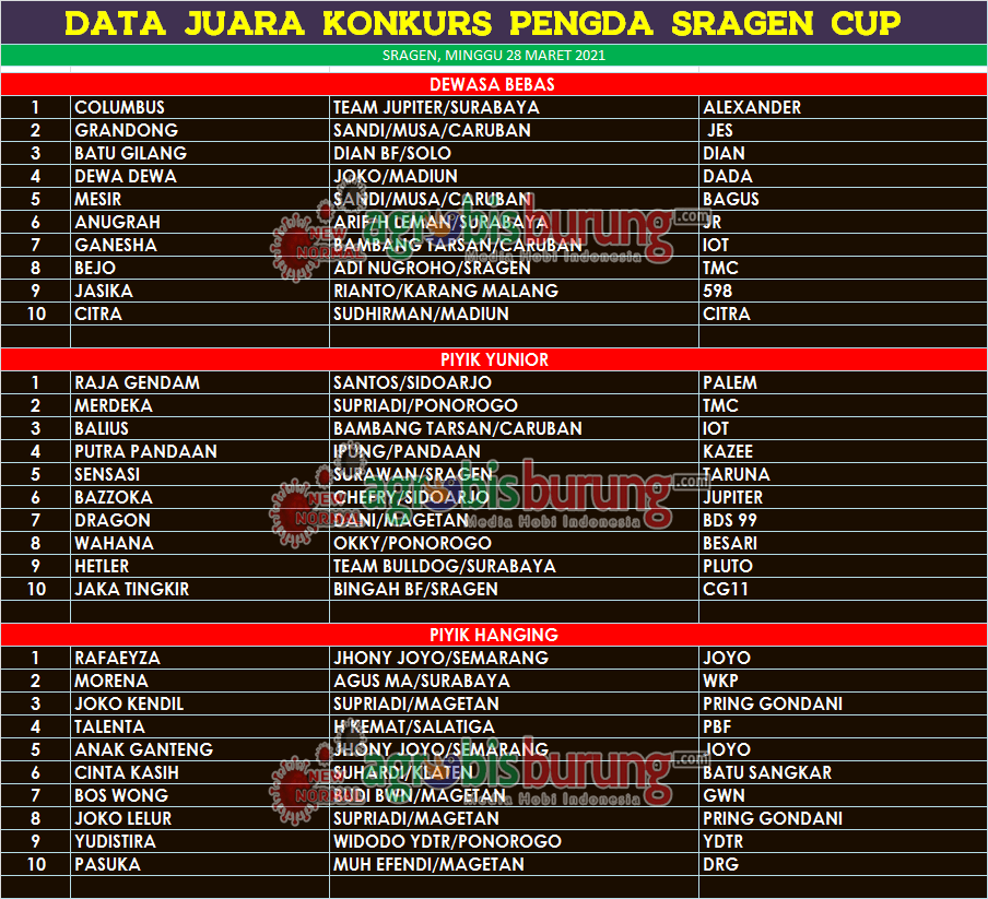 Sementara itu jalannya lomba memang lebih di dominasi jago jago dari luar Sragen yang memang sengaja ngluruk Sragen, di dewasa bebas Columbus bergelang Alexander milik Team Jupiter Surabaya benar benar tampil mendominasi jalannya lomba. Columbus mampu meredam Grandong bergelang Jes dan Batu Gilang bergelan Dian yang berada di posisi kedua dan ketiga.