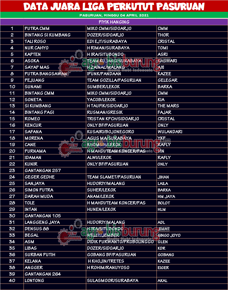 PASURUAN, agrobisburung.com –  Data Juara Liga Hanging Pasuruan , Minggu 04 April
