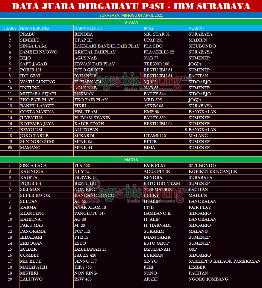 Derkuku-Puter Derkuku-Puter Headline Hobi Burung Juara Organizer Profil Data Juara Dirgahayu P4SI – IBM di Surabaya, Minggu 04 April agrobisburung 8 April 2021 Data Juara Dirgahayu P4SI – IBM di Surabaya, Minggu 04 April Tinggalkan Komentar SURABAYA, agrobisburung.com – Data Juara Dirgahayu P4SI – IBM di Surabaya, Minggu 04 April Tinggalkan Komentar Post navigation Previous: Tiket Rp 100 Ribu Hadiah Rp 5 Juta? Siapkan Sangkar Phantom dari Sekarang! Next: Singa Laut Tampil Memukau di Madya, Dihadang Prabu dan Sembilu Saat Turun Utama di Latpres Dirgahayu P4SI Suroboyo Wani More Stories Headline Perkutut Profil Carpenter BF Mataram NTB, Kembangkan 50 Kandang Unggulan Dengan Trah Jawara agrobisburung 16 Desember 2025 Headline Perkutut Profil Satu Lagi Big Bos Asal NTB Bakal Ramaikan Perkutut Nasional 2026, Samuel BLT Arrowhead Siap Berkolaborasi HDL – Carpenter Dengan Amunisi Istimewa agrobisburung 15 Desember 2025 Headline Organizer Perkutut Hasil Rakerwil Jawa Tengah 2025 : Lanjutkan LLBJ Sebanyak 10 Putaran, Meramaikan Daerah dengan program Liga Piyik di Masing Masing Pengda agrobisburung 15 Desember 2025