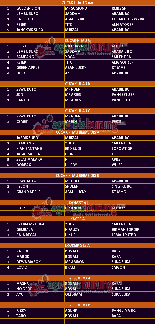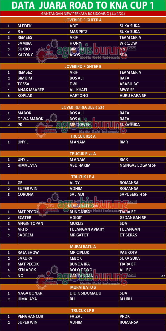 Headline Hobi Burung Juara Kicauan Kicauan Organizer Profil Data Juara Road To KNA Cup 1 di Sidoarjo, 11 April agrobisburung 20 April 2021 Data Juara Road To KNA Cup 1 di Sidoarjo, 11 April Tinggalkan Komentar SIDOARJO, agronbisburung.com – Data Juara Road To KNA Cup 1 di Sidoarjo, 11 April Tinggalkan Komentar Post navigation Previous: Data Juara Road To Cahaya Fiesta 2021 Di Batang, Minggu 18 AprilNext: Mahameru, Petir, Zolla, X-Pander Dan Mahadewa Menjadi Bintang Lapangan Di Road To Cahaya Fiesta More Stories Headline Hobi Lain Perkutut Profil Christa Dwipa Praya NTB, Bakal Comeback Lomba Dengan Amunisi Ciamik Miliknya agrobisburung 17 Desember 2025 Headline Perkutut Profil Carpenter BF Mataram NTB, Kembangkan 50 Kandang Unggulan Dengan Trah Jawara agrobisburung 16 Desember 2025 Headline Perkutut Profil Satu Lagi Big Bos Asal NTB Bakal Ramaikan Perkutut Nasional 2026, Samuel BLT Arrowhead Siap Berkolaborasi HDL – Carpenter Dengan Amunisi Istimewa agrobisburung 15 Desember 2025