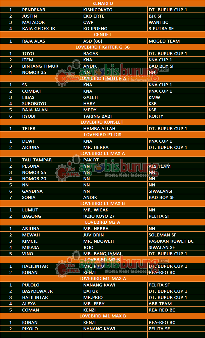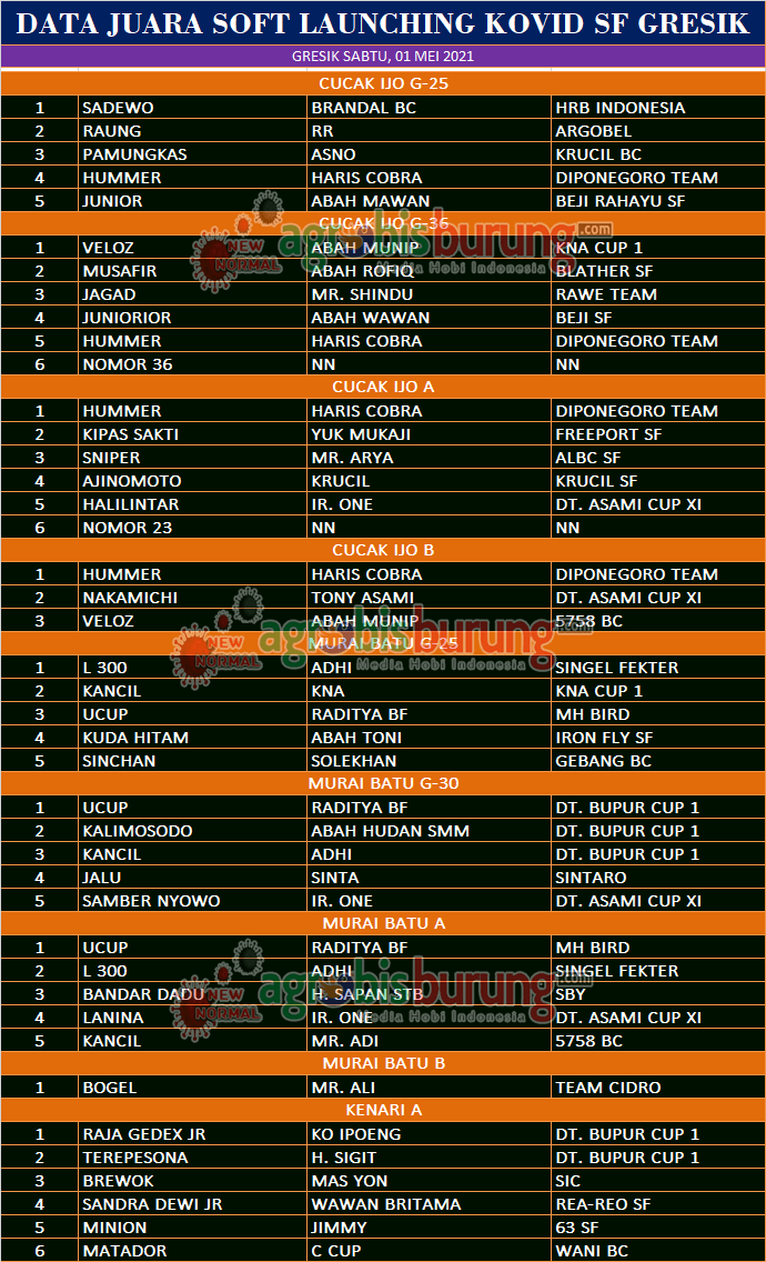 GRESIK, agrobisburung.com – Data Juara Soft Lounching Kovid SF di Gresik, Sabtu 01 Mei