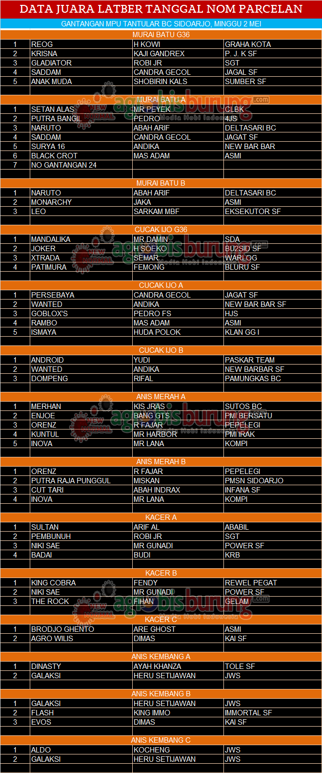 Data Juara Latber Tanggal Non Parcelan Di Mpu Tantular BC Sidoarjo, Minggu 02 Mei