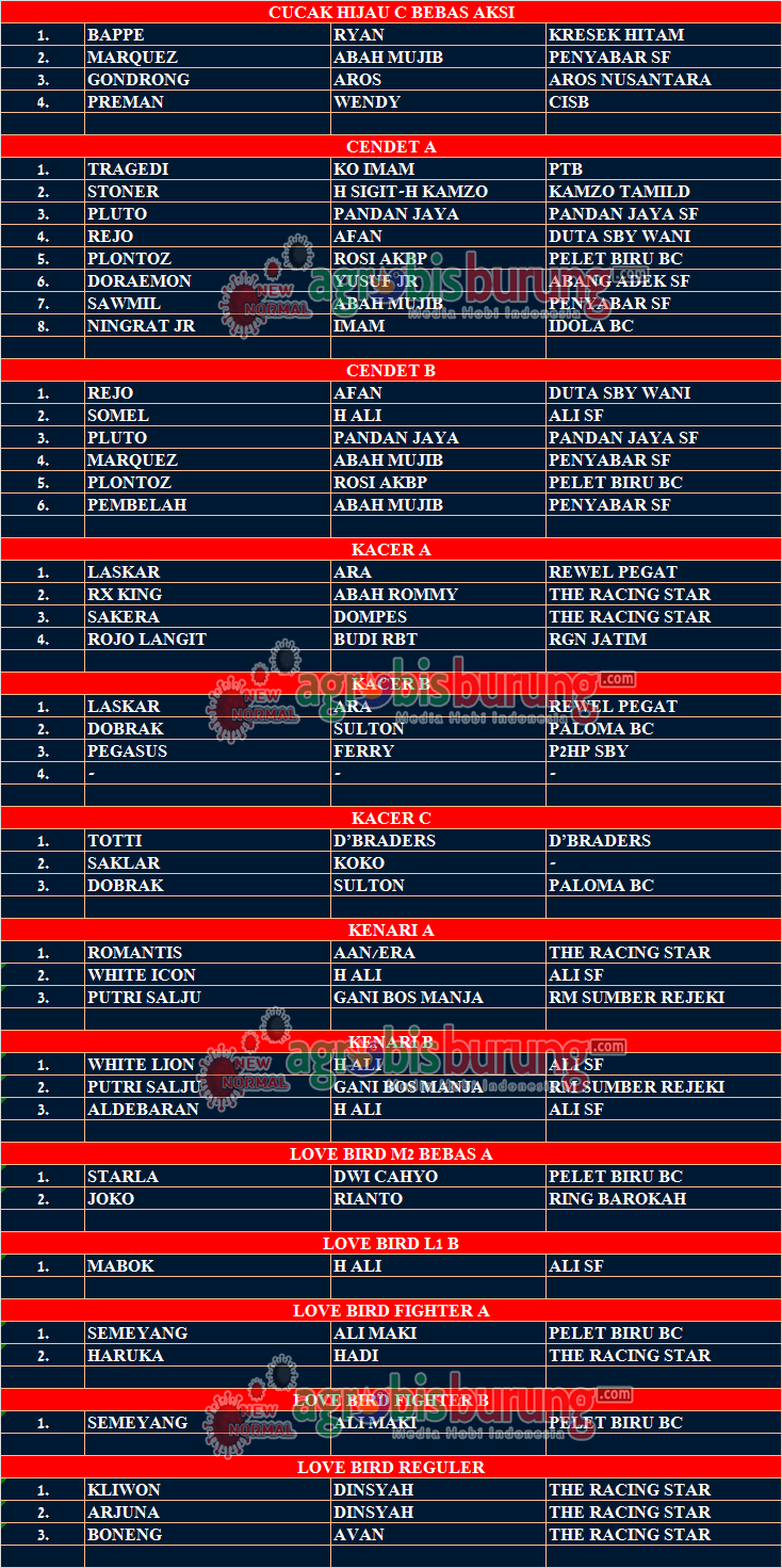 Headline Hobi Burung Juara Kicauan Kicauan Organizer Profil Data Juara Ngak Obah Yoes Tatto Gak Magan Cup 2 di Surabaya, Minggu 09 Mei agrobisburung 12 Mei 2021 Data Juara Ngak Obah Yoes Tatto Gak Magan Cup 2 di Surabaya, Minggu 09 Mei Tinggalkan Komentar SURABAYA, agrobisburung.com – Data Juara Ngak Obah Yoes Tatto Gak Magan Cup 2 di Surabaya, Minggu 09 Mei Tinggalkan Komentar Post navigation Previous: Data Juara Anniversary AKM # 4 di Ambarawa, Minggu 09 MeiNext: CH Wisanggeni Curi 1 Kemenangan Dalam Yoez Tattoo Gak Obah Gak Mangan Cup 2 Surabaya More Stories Headline Juara Perkutut Pemanasan Jelang Pembukaan LPJB 2026, Unicorn Naik Kelas & Cirebon Trusmi Ngorbit di Liga Kopi Luhur #6 (Penutupan Poin) Cirebon agrobisburung 18 Januari 2026 Headline Hobi Lain Juara Perkutut Jawara Airlanga Moncer Bareng bersama Antsena & Mr M-307 Di Latihan Dinilai Tarkam Galaxy Gresik agrobisburung 18 Januari 2026 Headline Juara Perkutut Jawara Red Bull “Pecah Telor” Empat Warna Di Latihan Dinilai Dewandaru Tulungagung, Jawara Sulur Mas & Deva Alam Moncer di Podium Utama agrobisburung 18 Januari 2026