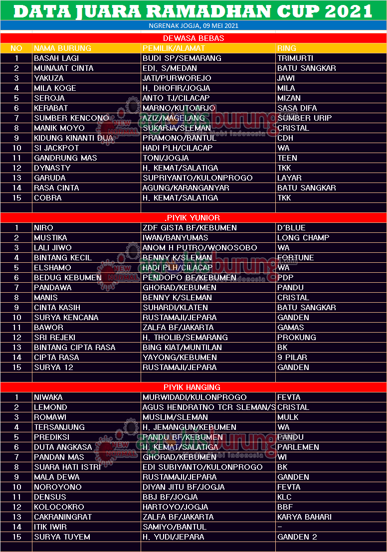 Sementara itu jalannya lomba memang sangat luar biasa jalannya pertandingan , maklum banyak tetamu dari Jogja yangmerapat di Ramadhan Cup Jogja, di dewasa bebas Basah Lagi bergelanr Tri Murti yang memang sudah memiliki jam terbang tinggi langsung melejit di podium pertama. Disusul Munajat Cinta bergelang Batu Sangkar dan Yakuza bergelang Jawi yang berada di posisi kedua dan ketiga.