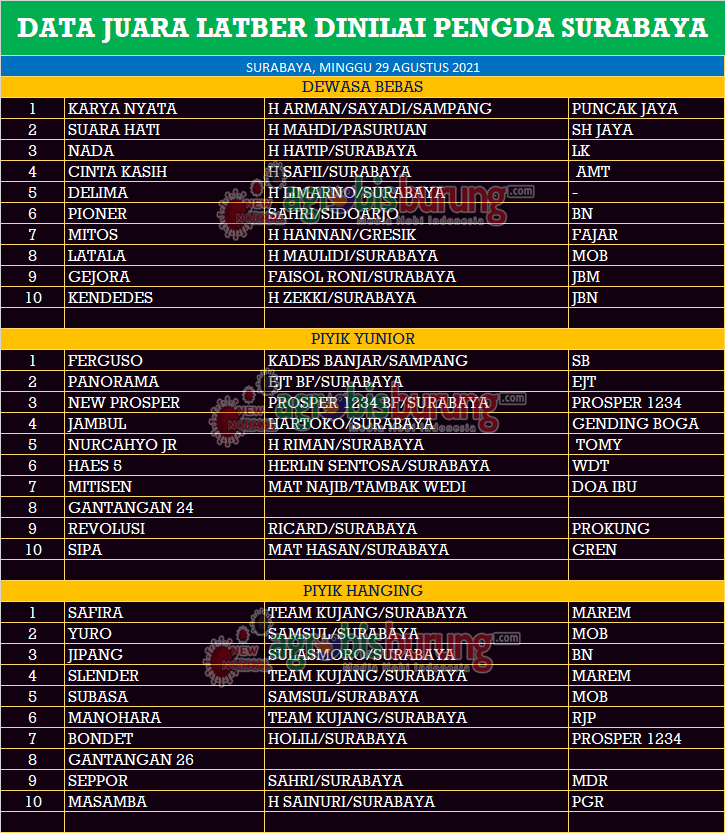 Kejuaraan di dewasa bebas mengantarkan Karya Nyata di kerekan 128, peserta tamu dari Sampang milik H Arman/Sayadi melejit di posisi puncak setelah menggeser beberapa lawan tarungnya saat latber. Karya Nyata benar benar tampil bagus, produk Puncak Jaya milik Sayadi yang juga perawat burung tersebut benar benar puas karena setelan Karya Nyata pas saat di latber Surabaya. Sementara Suara Hati bergelang SH Jaya milik H Mahdi Pasuruan dan Nada bergelang LK milik H Hatip Surabaya menyusul di posisi kedua dan ketiga.