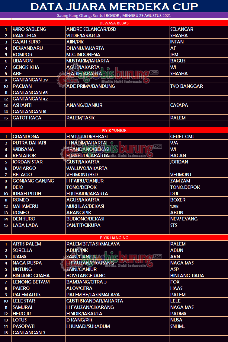 BOGOR, agrobisburung.com – Gelaran lomba di berbagai blok tampaknya sudah mulai di laksanakan , termasuk di blok Jabodetabek yang menggelar Merdeka Cup 2021 pada Minggu (29/08) di Saung Kang Otong Sentul Bogor sukses dengan gelarannya. Kehadiran beberapa tokoh perkutut nasional seperti H Gunawan, Nadim (Pemain lama), H Arif, Gusti Iskandar/H Tas, Billah, Andre Selancar, Abun, Bambang Kancil dan beberapa tokoh lainnya membuat jalannya lomba semakin bersemangat. Dan jago jago terbaikpun  ikutan tampil gemilang dimasing masing kelasnya.