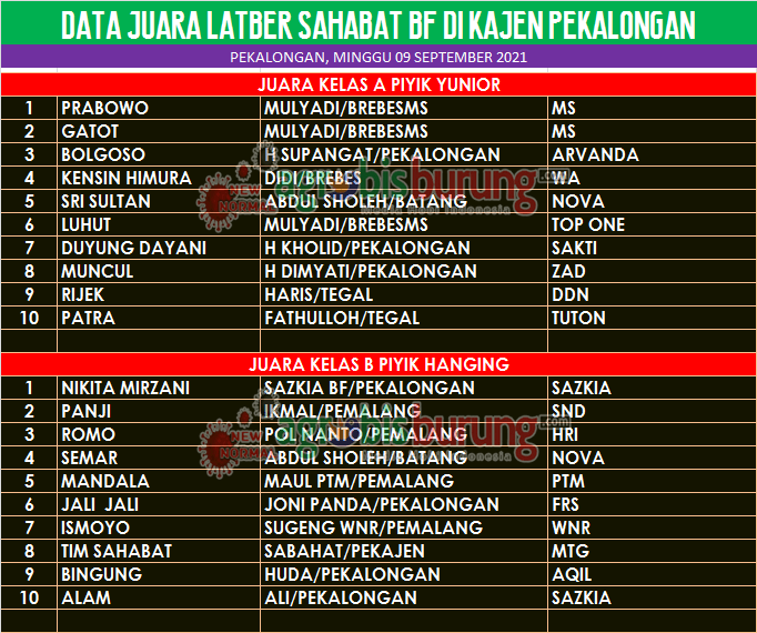 Di piyik yunior, debutan Prabowo bergelang MS milik Mulyadi Brebes yang memang sudah di poles untuk tampil joss di Pekalongan mampu merdam semua gempuran lawan lawannya dan diakhir babak Prabowo tak terbendung melaju di podium pertama. Di kelas piyik hanging, Nirkita Mirzani yang memang “genit” bikin lawan lawannya tidak fokus, sehingga sampai setengah permainan saja Nikita Mirzani mampu menguasai permainan dan akhirnya merebut mahkota utama di posisi pertama. AB-ONA/end