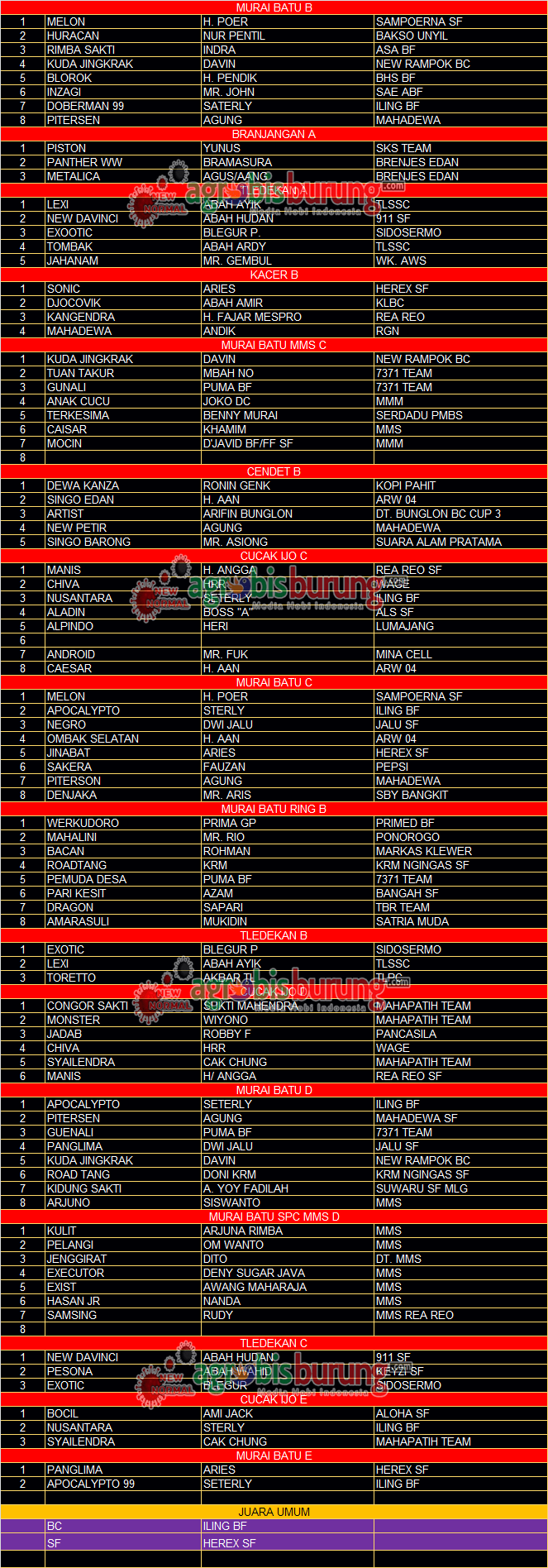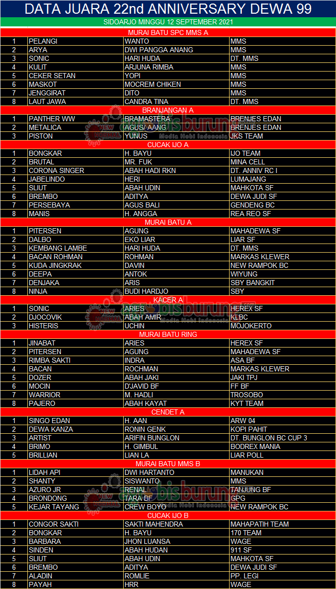Headline Hobi Burung Juara Organizer Perkutut Perkutut Profil Data Juara 22 nd Anniversary Dewa 99 di Sidoarjo, Minggu 12 September agrobisburung 13 September 2021 Data Juara 22 nd Anniversary Dewa 99 di Sidoarjo, Minggu 12 September Tinggalkan Komentar SIDOARJO, agrobisburung.com – Data Juara 22 nd Anniversary Dewa 99 di Sidoarjo, Minggu 12 September Tinggalkan Komentar Post navigation Previous: Longsor Melejit di Dewasa & 5 Produk JBM dominasi Piyik Yunior, Oggy Kuasai Piyik di Jangkar Mas Cup SitubondoNext: Data Juara Latihan Dinilai Shasha BF di Jakarta, Minggu 12 September More Stories Headline Hobi Lain Perkutut Profil Christa Dwipa Praya NTB, Bakal Comeback Lomba Dengan Amunisi Ciamik Miliknya agrobisburung 17 Desember 2025 Headline Perkutut Profil Carpenter BF Mataram NTB, Kembangkan 50 Kandang Unggulan Dengan Trah Jawara agrobisburung 16 Desember 2025 Headline Perkutut Profil Satu Lagi Big Bos Asal NTB Bakal Ramaikan Perkutut Nasional 2026, Samuel BLT Arrowhead Siap Berkolaborasi HDL – Carpenter Dengan Amunisi Istimewa agrobisburung 15 Desember 2025