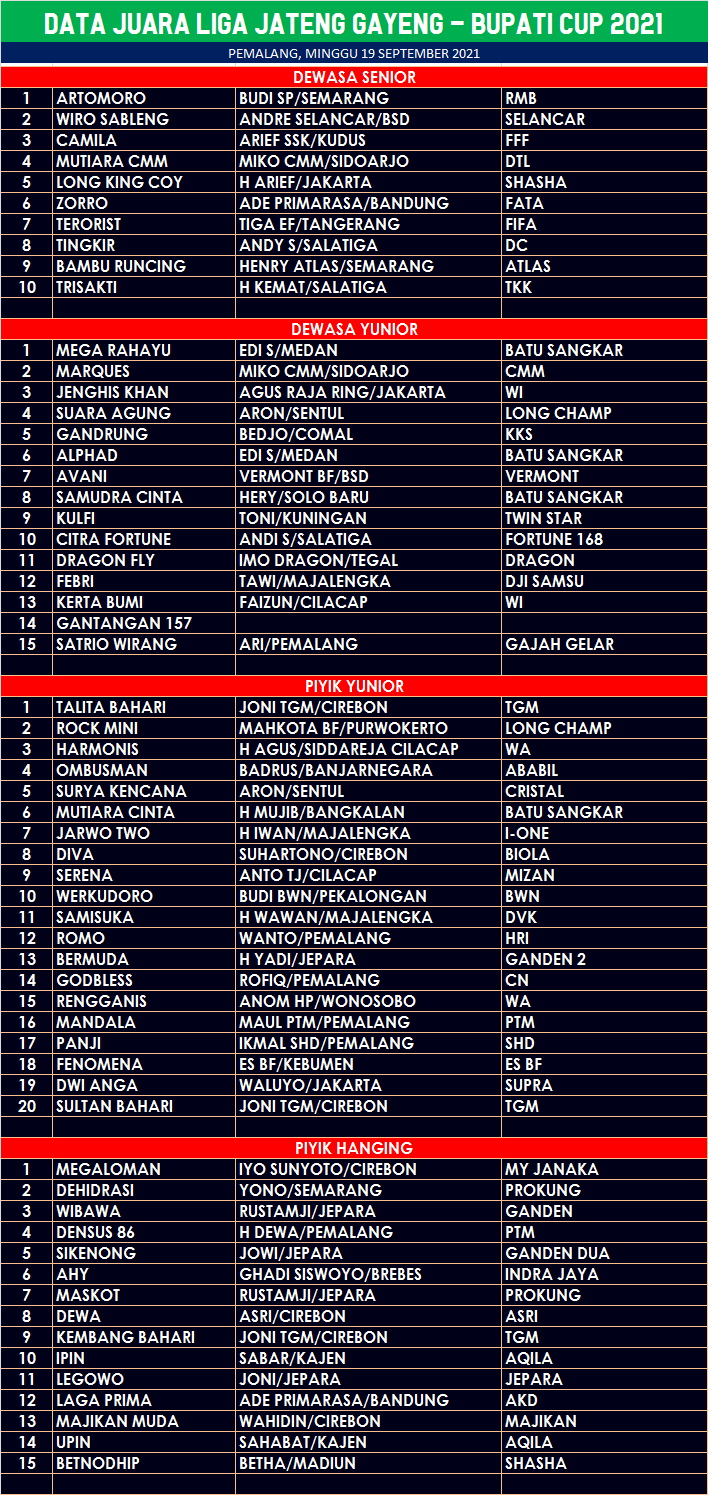 Data Juara Liga Jateng Gayeng – Bupati Cup 2021 di Pemalang, Minggu 19 September