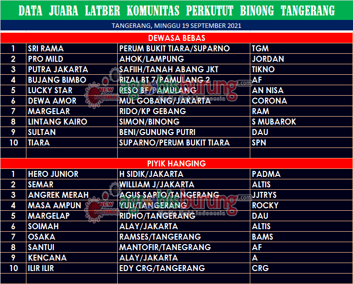 TANGERANG, agrobisburung.com – Latber perkutut di lapangan Binong yang di gelar komunitas perkutut Binong Tangerang kembali dilaksanakan pada Minggi (19/09) dengan sukses dan lancar. Kungmania seputar Binong dan Jakarta ikut hadir di arena untuk meramaikan kegiatan latber yang mulai semarak setelah masa PPKM darurat. Kali ini dua kelas yang dimainkan di agendanya yaitu kelas dewasa bebas dan piyik hanging. Di dewasa bebas debutan anyar Sri Rama bergelang TGM milik Suparno mampu menujukkan kehebatannya merebut kemenangan pertama dari Pro Mild & Putra Jakarta yang harus puas di posisi kedua dan ketiga. Di kelas piyik hanging, Hero Junior bergelang Padma melejit di posisi pertama.