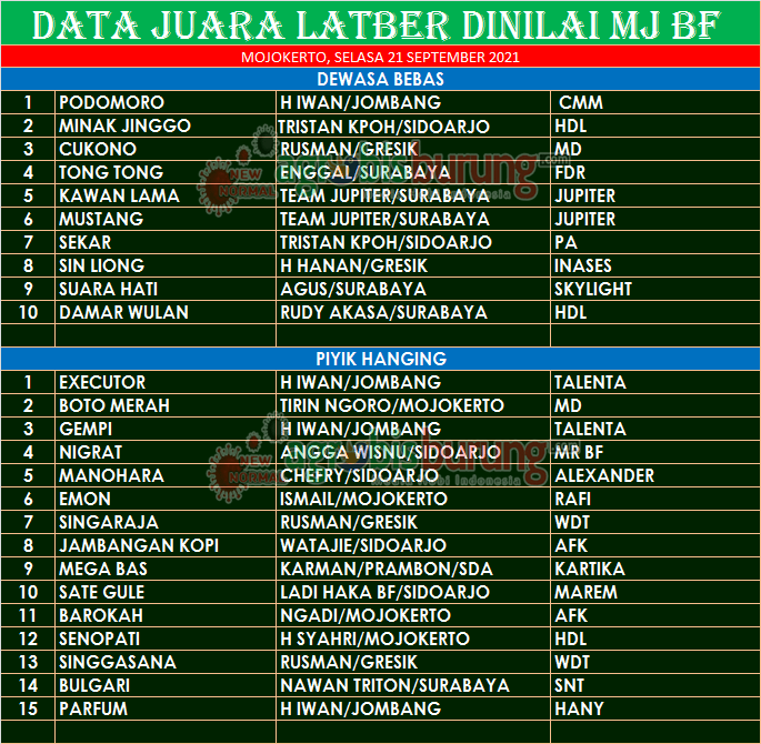 MOJOKERTO, agrobisburung.com – Perburuan jawara jawara ciamik yang dilakukan H Iwan dalam sebulan terakhir benar benar membawa hasil, burung burung muda yang diprediksi bakal moncar di lapangan satu persatu dibuktikannya. Hal ini dibuktikan di latber dinilai di markas MJ (Mojopahit Bf) Mojokerto pada Selasa (21/09), dua debutannya tampil garang dan mampu merebut podium pertama di dua kelas yang di mainkan. Di dewasa bebas, debutan Podomoro bergelang CMM yang memang memilik kualitas joss mampu tampil brilian dan mampu menaklukkan Minak Jinggo bergelang PA dan Cukono bergelang MD yang merebut posisi kedua dan ketiga.