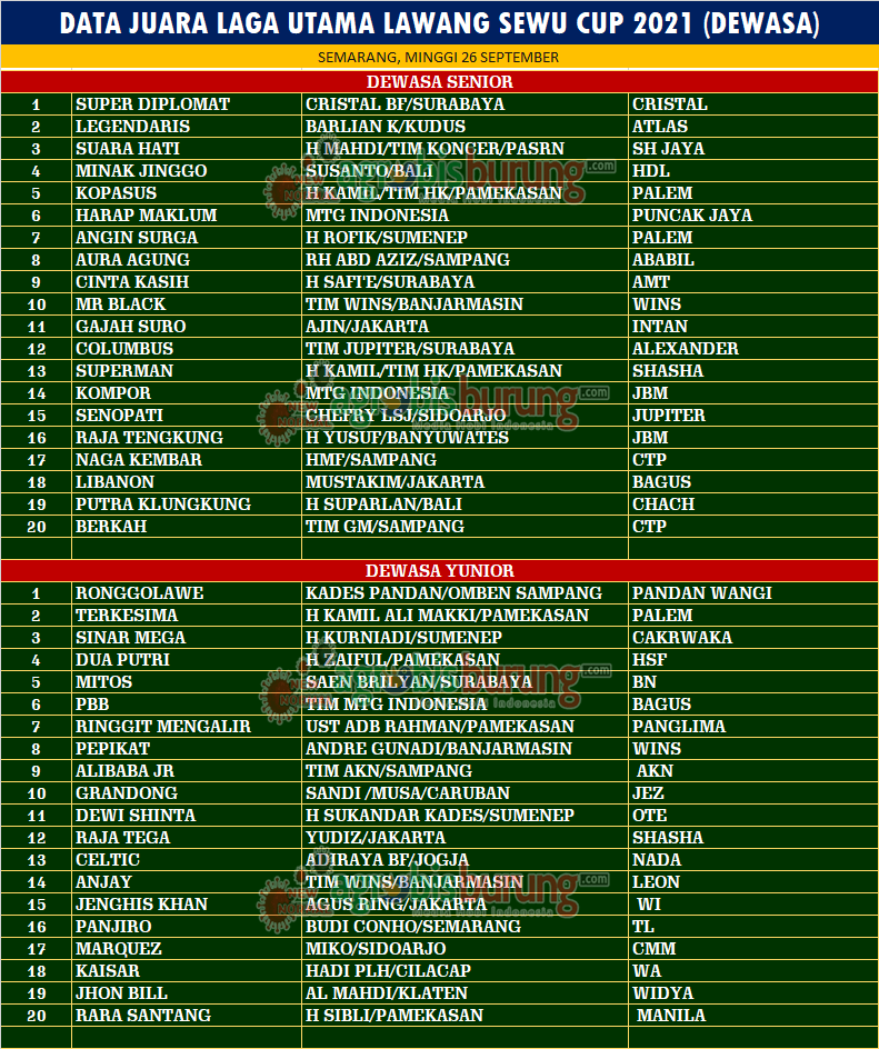 Headline Hobi Burung Juara Organizer Perkutut Perkutut Profil Data Juara Laga Utama Lawang Sewu Cup 2021 (Dewasa) di Semarang, Minggu 26 September agrobisburung 26 September 2021 SEMARANG, agrobisburung.com – Data Juara Laga Utama Lawang Sewu Cup 2021 (Dewasa) di Semarang, Minggu 26 September Tinggalkan Komentar Post navigation Previous: Rem Blonk Produk CTP Bangkalan yang mampu Obrak Abrik persaingan Papan Atas di blok netralNext: Data Juara Konkurs Gebyar Garut Cup 2021, Minggu 26 September More Stories Headline Juara Perkutut Pemanasan Jelang Pembukaan LPJB 2026, Unicorn Naik Kelas & Cirebon Trusmi Ngorbit di Liga Kopi Luhur #6 (Penutupan Poin) Cirebon agrobisburung 18 Januari 2026 Headline Hobi Lain Juara Perkutut Jawara Airlanga Moncer Bareng bersama Antsena & Mr M-307 Di Latihan Dinilai Tarkam Galaxy Gresik agrobisburung 18 Januari 2026 Headline Juara Perkutut Jawara Red Bull “Pecah Telor” Empat Warna Di Latihan Dinilai Dewandaru Tulungagung, Jawara Sulur Mas & Deva Alam Moncer di Podium Utama agrobisburung 18 Januari 2026